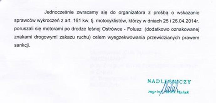 Jakby tego jeszcze było mało, autor protestu odwołał się również do rolników, bo w końcu lepiej mieć zawsze w zanadrzu jakiegoś miejscowego sprzymierzeńca z widłami i kosą. Zaraz znalazło się kilku miejscowych gospodarzy, którzy widzieli jak po ich polu przejechało kilka motocykli i zniszczyło nieodwracalnie plony. Jakie plony uległy zniszczeniu nie ujawniono jednak publicznie. Trudno więc powiedzieć jakiego rodzaju koszty ponieśli i czy była to zgnieciona trawa, zboże, czy plantacja konopii indyjskich. Zważając na powyższe fakty Pan Marek zaapelował o dezaprobatę wobec wydawania zgody na przeprowadzenie nowej edycji rajdu. (jakby wcześniej nie zaprzeczał sobie, że rajd jest nielegalny). Na końcu petycji jaką napisał i podpisał własnoręcznie, zaapelował również do odpowiednich organów i do organizatora (czyli Uczniowskiego Klubu Sportowego Mechanik znajdującego się przy Zespole Szkół Ponadgimnazjalnych w Żninie) o ujawnienie sprawców zniszczenia ściółki i innych powstałych wykroczeń. Sprawców tych po ujawnieniu należy przekazać w sprawiedliwe ręce organów ścigania, w celu ukarania. I tutaj od razu zaproponował jako wybitny znawca prawa i Kodeksu Wykroczeń podstawę prawną, z jakiego tytułu mają odpowiadać sprawcy - bo z art. 161 KW. Chodzi mianowicie o osoby, które poruszały się 25 i 26.04.2014 r. na drodze leśnej Ostrówce-Folusz, na której znajdują się dodatkowo znaki zakazu wjazdu.