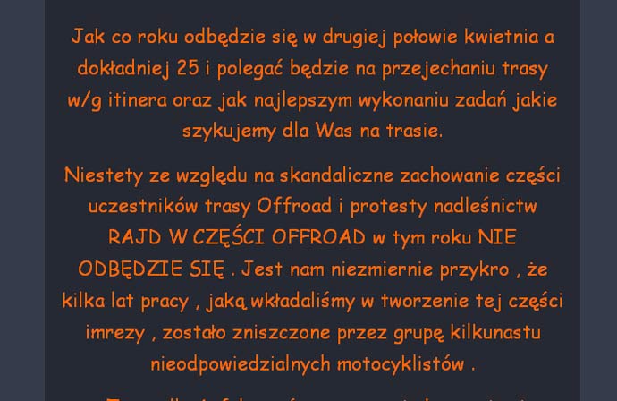 W tym roku miała to już być VI edycja Rajdu Enduro na Pałukach. Impreza wpisała się już w kalendarz turystyki motocyklowej i lekkiego offu i ma wielu zwolenników i wyznawców przyjeżdzających z całej Polski. Niedawno ukazała się jednak na stronie internetowej organizatora lakoniczna wzmianka, że w tym roku nie będzie podziału na asfaltowców i łofrodowców, bo motocykliści na to nie zasłużyli dobrym zachowaniem, są mówiąc kolokwialnie okropni i zachowują się "skandalicznie". Zamiast ścigania, aktywnej rajdowej rywalizacji będzie za to trasa asfaltem, zabawy ruchowe i intelektualne przy ognisku i wykonywanie zadań manualno-zręcznościowych w punktach kontrolnych. Mówiąc wprost rajdu nie będzie w takiej formie jakiej znamy z poprzednich lat... Czemu zlikwidowano offroad, który cieszył się bardzo dużym zainteresowaniem i miał promować niewątpliwe zalety krajobrazowe Ziemi Pałuckiej? Organizatorzy podają, że spowodowane to było protestami i vetem nadleśnictw, które nie chcą na swoim terenie więcej rajdów motocyklowych i niesfornych "pseudomotocyklistów". Może nie tyle nadleśnictw co jednego nadleśnictwa w Gołąbkach, któremu szefuje magister inżynier Marek Malak.