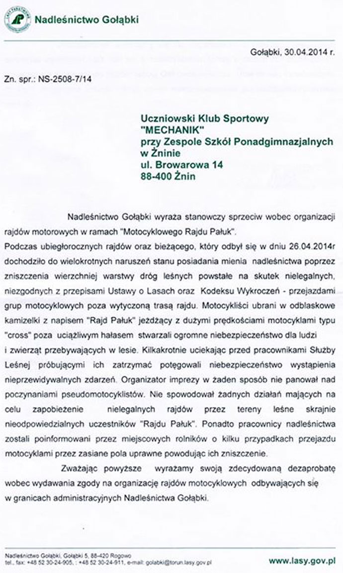 Nieco poźniej nadleśniczemu jednak ponownie puściły nerwy i niebawem zaczęli mu przeszkadzać motocykliści. Musiał w końcu ukierunkować swoją flustrację na coś nowego. W 2014 r. zaraz po zakończeniu V edycji Rajdu Pałuk Marek Malak wystąpił z oskarżeniami w oficjalnym piśmie, w którym motocykliści byli uosobieniem całego zła znajdującego się w samym lesie, na Ziemi Pałuckiej, na kuli ziemskiej, a może i nawet w kosmosie. W liście skierowanym do Marszałka Województwa Kujawsko-Pomorskiego Piotra Całbeckiego, Wójtów Gminy Dąbrowa, Gąsawa, Burmistrzów Łabiszyna, Barcina, Mogilna i innych wszystkich świętych Marek Malak zarzucił motocyklistom niszczenie ściółki, uciążliwy hałas i ogromne zagrożenie dla ludzi i zwierząt spowodowane prędkością. Co więcej imprezę, która miała charakter całkowicie legalny i autoryzowany przez burmistrzów wspomnianych miejscowości i właściwe organa leśne nazwał imprezą nielegalną, a uczestników biorących udział w tej hućpie nazwał "skrajnie nieodpowiedzialnymi". Na dowód tego przytoczył też w swoim expose przypadek kilkukrotnego pościgu Straży Leśnej za motocyklistami, który niestety zakończył się porażką w/w służb. Sprawcy wykroczeń posiadający odblaskowe kamizelki z logo Rajdu Pałuk uciekali bowiem motocyklami "cross", które jak wiadomo rozwijają nieobliczalne prędkości, co "potęgowało niebezpieczeństwo powstania nieprzewidywalnych zdarzeń".