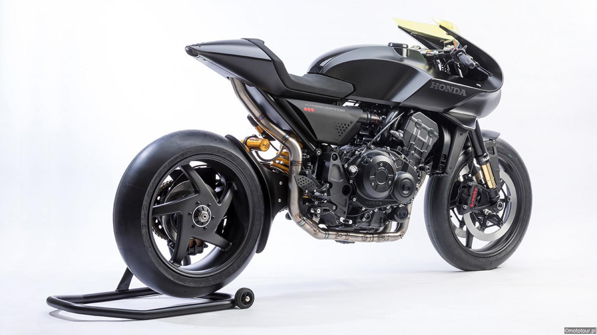 CB4 "Interceptor" to kolejna wersja motocykla koncepcyjnego, który po raz pierwszy zaprezentowany został jako "CB4" na targach EICMA w 2015 roku. Pewnie nie trafi nigdy do produkcji. Choć tego nie wiemy do końca. Jednak stoisko Hondy 2017 na targach EICMA budziło szczególne zainteresowanie. Projekt powstał w zakładzie badawczo-rozwojowym Hondy w Rzymie. Przydomek "Interceptor" mówi wiele, w jakim kierunku podążać będą projekty projektantów. Nowy model dostał sugestywną "sportową sylwetkę" i tworzy nową perspektywę w świecie Café Racerów. Czy na tym opierać się będzie cała seria? Najważniejsza jest jednak kolorystyka. To "całkowita czerń", łącząca elegancję, prestiż i sportowy charakter, pozostawiając miejsce dla futurystycznej technologii zintegrowanej z płynnymi liniami. Pozostaje pytanie. Kto dzisiaj chciałby mieć czarny motocykl. A jednak...Te odejście od kolorowej, pstrokatej filozofii jest symptomatyczne. Pozostają również motywy ekologiczne. Gdzie? Z przodu znajdziemy wentylator służący do zamiany energii kinetycznej motocykla na czystą energię. Na baku dotykowy ekran zapewnia stałą łączność ze światem, umożliwiając wyświetlanie trasy i drogi przez mapy cyfrowe lub po prostu podłączanie innych urządzeń.