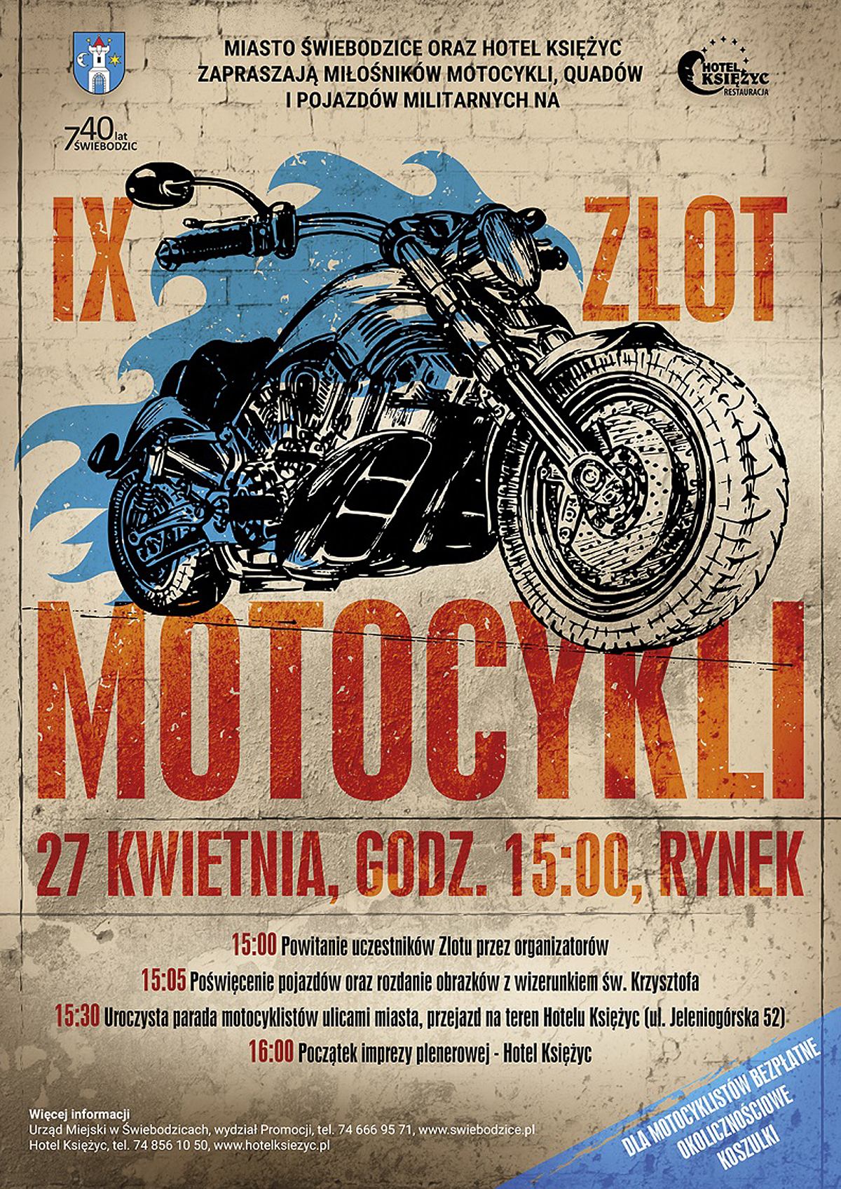 Zapraszamy Państwa na IX Zlot Motocyklowy. Początek imprezy to część oficjalna na Rynku. Następnie poświęcenie motocykli i rozdanie wizerównków Sw. Krzysztofa. Około godziny 15.30 przewidziana jest parada kolumny motocyklistów przez Rynek. Po paradzie, około godziny 16.00 nastąpi początek imprezy plenerowej, na terenie Hotelu Księżyc.