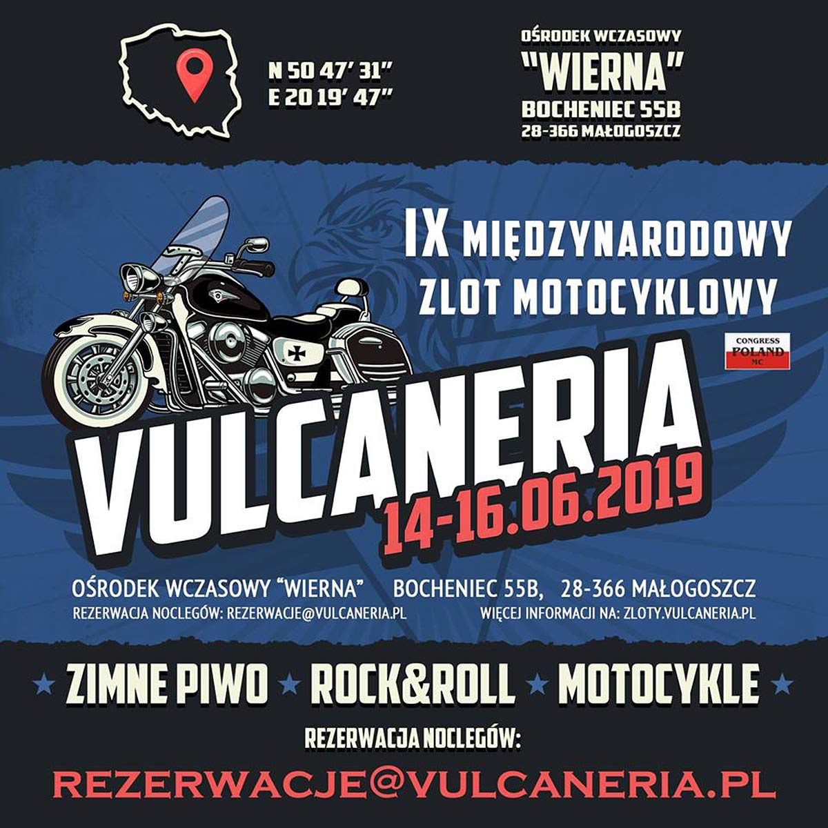 IX Międzynarodowy Zlot Motocyklowy Vulcaneria 2019. Start 14 czerwca o godzinie o 10:00. Ośrodek Wczasowy Wierna, Bocheniec 55B, 28-366 Małogoszcz.