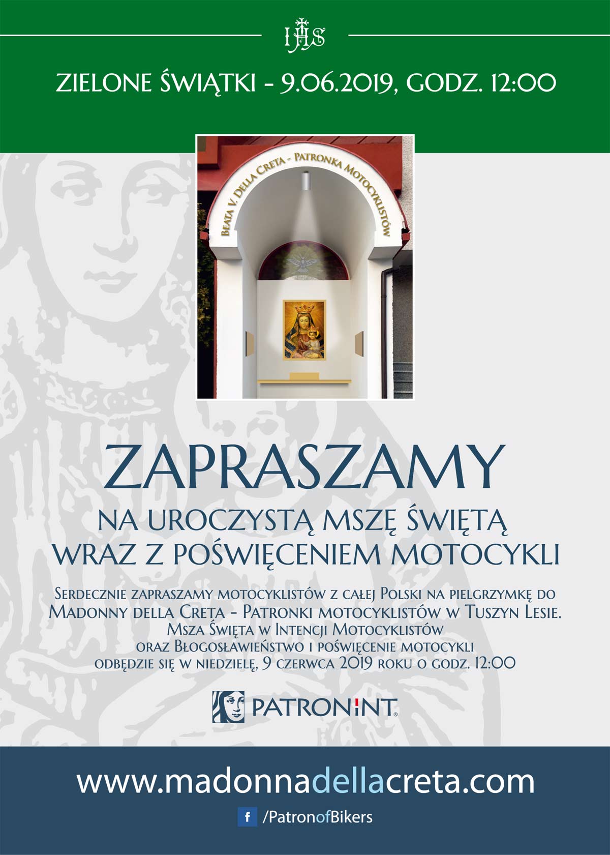 Serdeczne zapraszamy motocyklistów z całej Polski na pielgrzymkę do Madonny Della Creta - Patronki motocyklistów w Tuszynie Lesie. Msza święta w intencji motocyklistów i błogosławieństwo na tegoroczne wakacje odbędzie się w niedzielę 9 czerwca 2019 roku - Zielone Świątki godzina 12.00.
