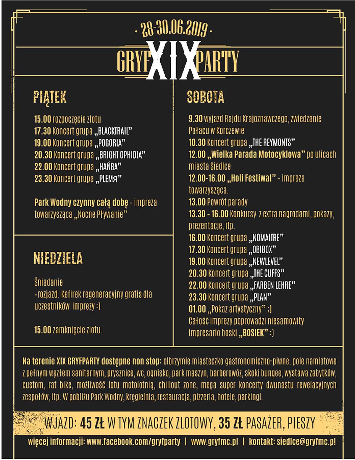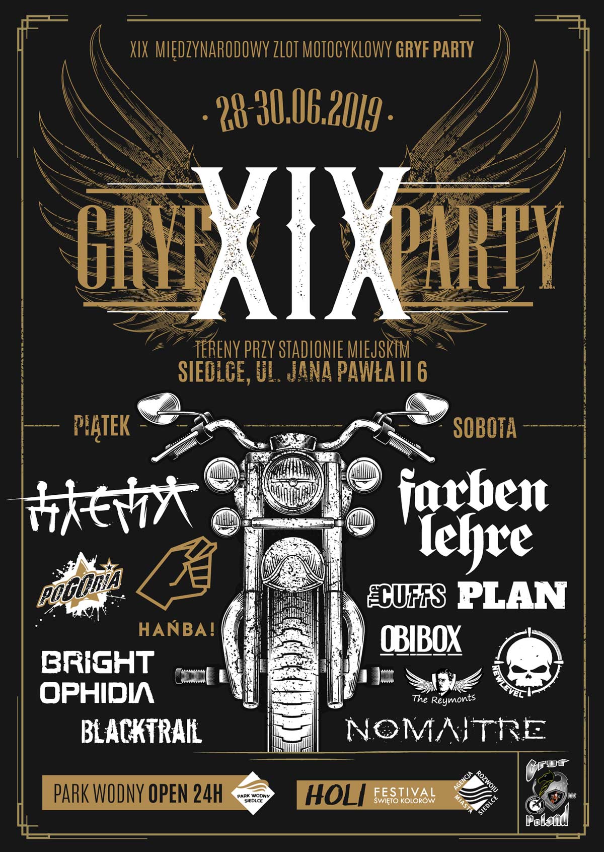 XIX Gryfparty 2019 - Międzynarodowy Zlot Motocyklowy. 12 rewelacyjnych kapel, w tym: PLEMЯ, THE REYMONTS, Pogoria, Hańba, BLACKTRAIL. "Mały siedlecki Woodstock"