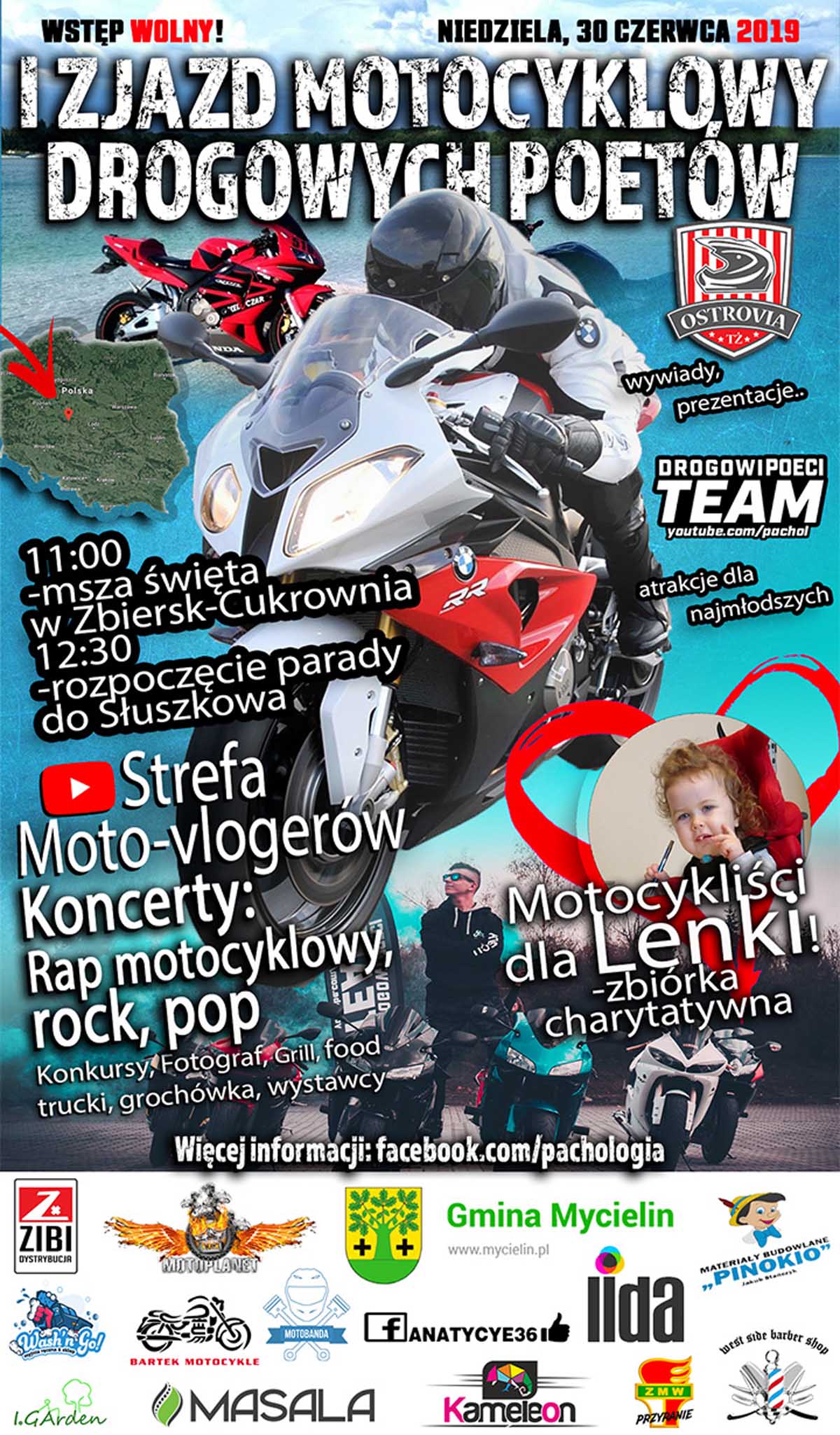 Nadszedł ten czas, kiedy z dumą możemy zaprosić Was na pierwszy Zjazd Motocyklowy Drogowych Poetów. Impreza ma charakter zlotu motocyklowego, rozpocznie się Mszą Świętą w Zbiersk-Cukrowni gdzie po święceniu maszyn udamy się paradą na boisko sportowe w Słuszkowie. Pokażemy Wam jak połączyć pasje, muzykę oraz pomoc niesioną innym! Serdecznie zapraszamy rodziny z dziećmi na boisko w Słuszkowie!