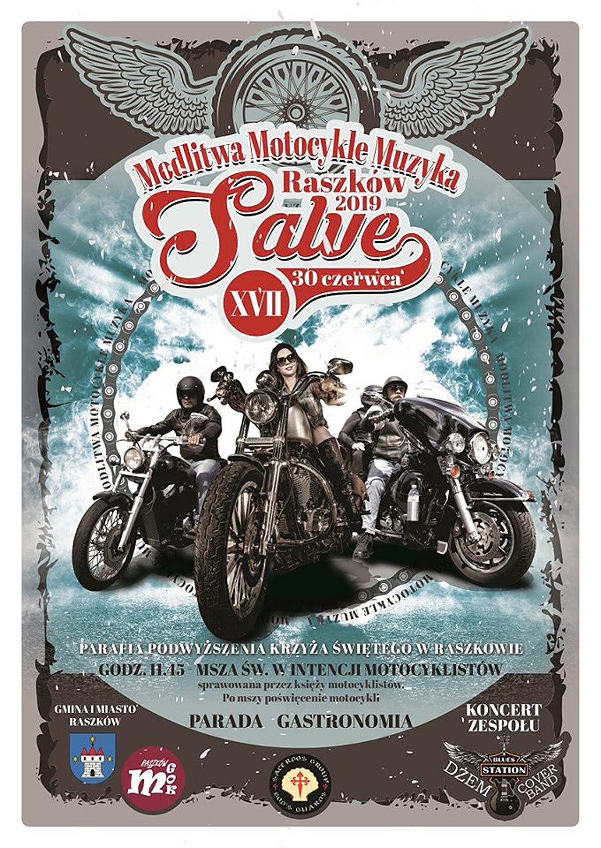 Modlitwa, motocykle, muzyka to trzy podstawowe filary szesnastej już edycji imprezy motocyklowej o nazwie Salve. Spotkania mają charakter wędrujący i odbywają się co roku w innej miejscówce, zazwyczaj jednak na terenie diecezji kaliskiej. W zeszłym roku był Wojków, a w tym Raszków. Kto nakręca imprezę? To księża motocykliści skupieni we własnym klubie motocyklowym. To harleyowcy z krwi i kości i dobrze czujacy klimaty motocyklowe. Oczywiście elementem przewodnim zlotu jest msza święta, odprawiana jednak zazwyczaj przez księży motocyklistów. Po mszy następuje parada, w której uczestniczy zazwyczaj kilka tysięcy rumaków, a następnie biesiada przy dźwiękach rocka.