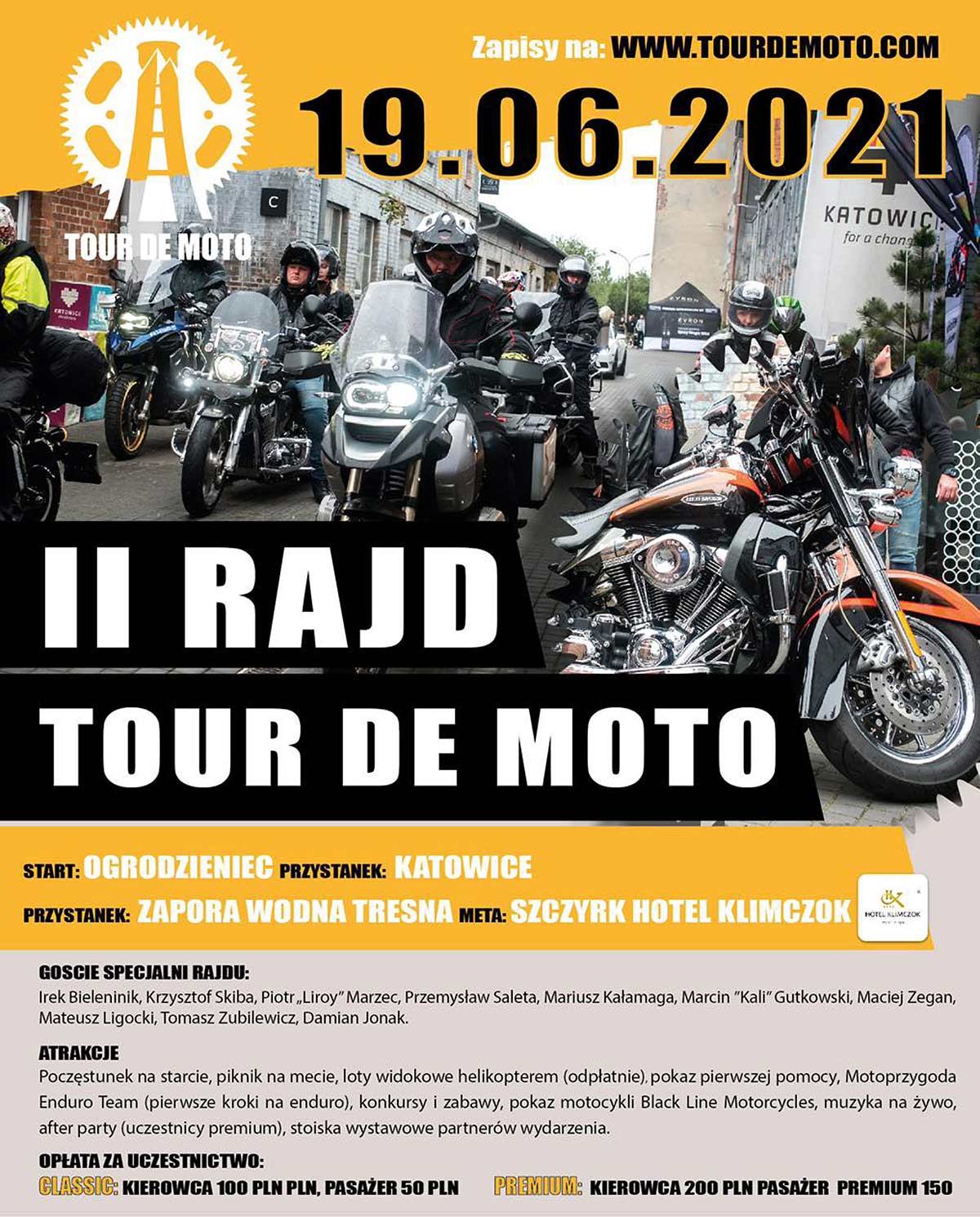 Rajd Tour de Moto to event skierowany do wszystkich motocyklistów, bez względu na markę czy moc silnika. To wspólny przejazd wzdłuż specjalnie opracowanej trasy. Trasa została wytyczona zasadniczo na drodze asfaltowej, wzdłuż której znajduje się kilka odcinków specjalnych i stacji kontrolnych. W ramach pakietu startowego za 100 PLN otrzymasz przygotowany roadbook i poczęstunek na mecie połączony z licznymi atrakcjami. Rajd TOUR DE MOTO ma formę rajdu o charakterze turystycznym. Klasyfikacja jest niezależna od osiągniętego czasu, ale od precyzji przejazdu. Początek trasy i miejsce spotkania: 19.06.2021 - OGRODZIENIEC. Meta znajduje się w miejscowości SZCZYRK i hotelu Klimczok. Konieczna rejestracja.