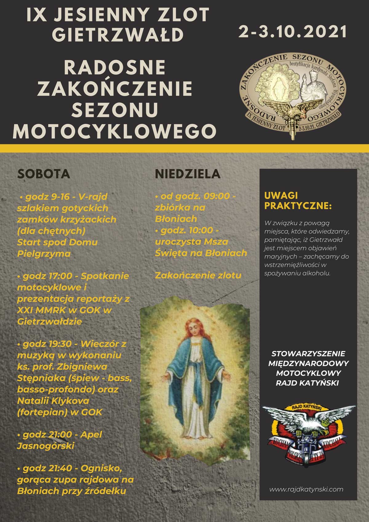 Coroczna impreza organizowana przez Stowarzyszenie Międzynarodowy Motocyklowy Rajd Katyński. W tym roku już IX edycja. Zakończenie Sezonu Motocyklowego, upamiętnienie Ks. Zdzisława Jastrzębiec Peszkowskiego. Jak zwykle spotkania, panele w Gminnym Ośrodku Kultury w Gietrzwałdzie, projekcje filmów, rozmowy, modlitwa, integracja. Do dyspozycji ekonomiczne noclegi w Domu Pielgrzyma i okolicznych pensjonatach. Dla chętnych możliwość rozstawienia namiotu na trawie. W sobotę wspólna wyprawa trasą zamków gotyckich na Warmii i Mazurach. W niedzielę zbiórka na Błoniach od godziny 9.00. O godzinie 10.00 przewidziano uroczystą Mszę Św.