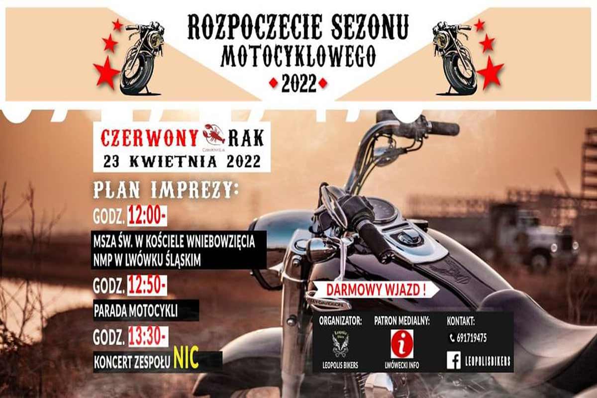 Stowarzyszenie Motocyklistów Leopolis Bikers zaprasza na Rozpoczęcie Sezonu Motocyklowego A. D. 2022. Spotkanie o godz 12.00 pod Kościołem Wniebowzięcia NMP w Lwówku Śląskim, skąd około 12.50 ekipa zlotowiczów wyruszy grupa paradną do Przystani Czerwony Rak. Na miejscu grill, kawa, herbata, domowe ciasta, oraz muzyka na żywo. Koncert zespołu NIC.