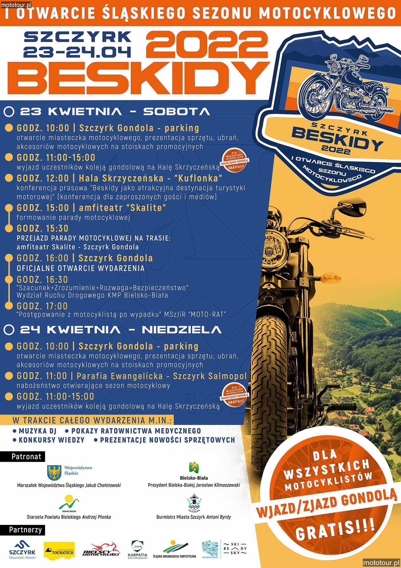10:00 - otwarcie miasteczka motocyklowego, prezentacja sprzętu, akcesoriów motocyklowych - miejsce: parking przy dolnej stacji kolei gondolowej, ul. Salmopolska 53 B