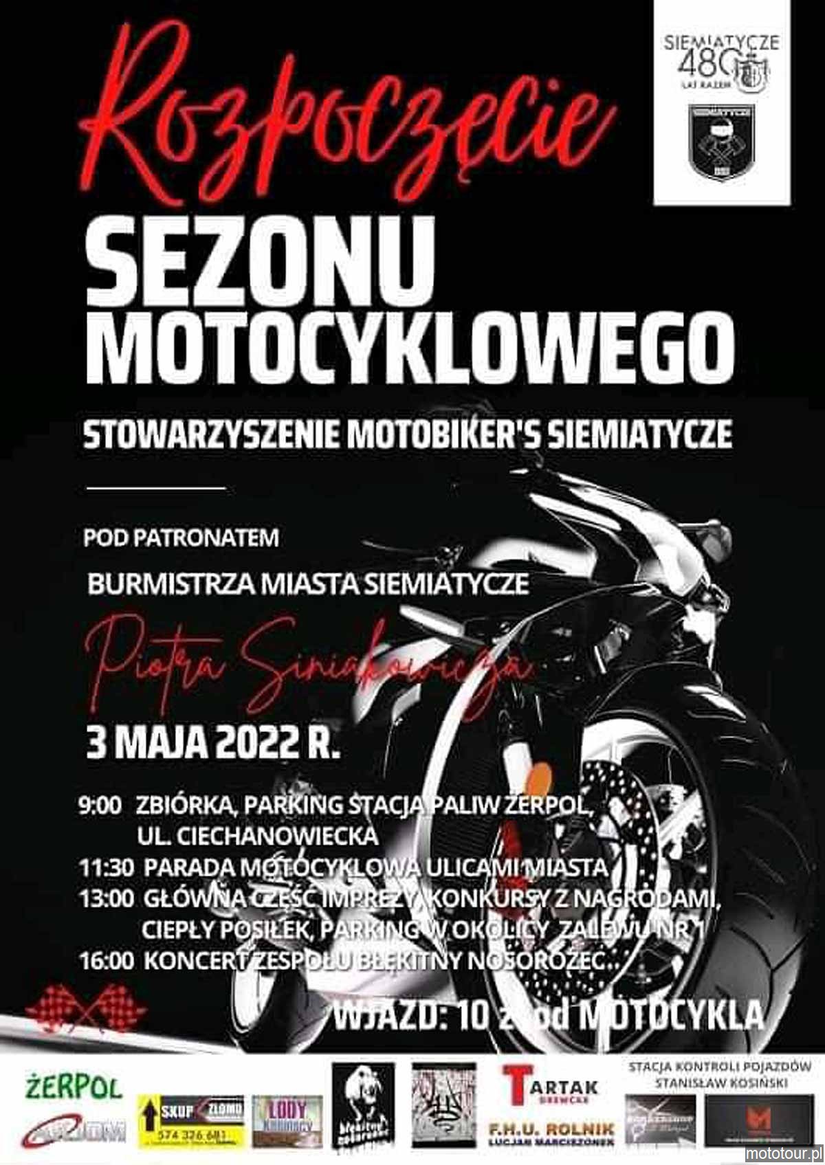 Motobikers Siemiatycze pod patronatem burmistrza Siemiatycz nakręca 3 maja Rozpoczęcie Sezonu Motocyklowego 2022. Wpadajcie już 3 maja 2022 r. do Siemiatycz. Zbiórka na parkingu na ul. Ciechnowieckiej - Stacja Paliw Zerpol. W programie zlotu parada motocyklowa, gorący poczęstunek, konkursy, zabawy zręcznościowe i koncert zespołu Błękitny Nosorożec. Wjazd 10 PLN od motocykla.