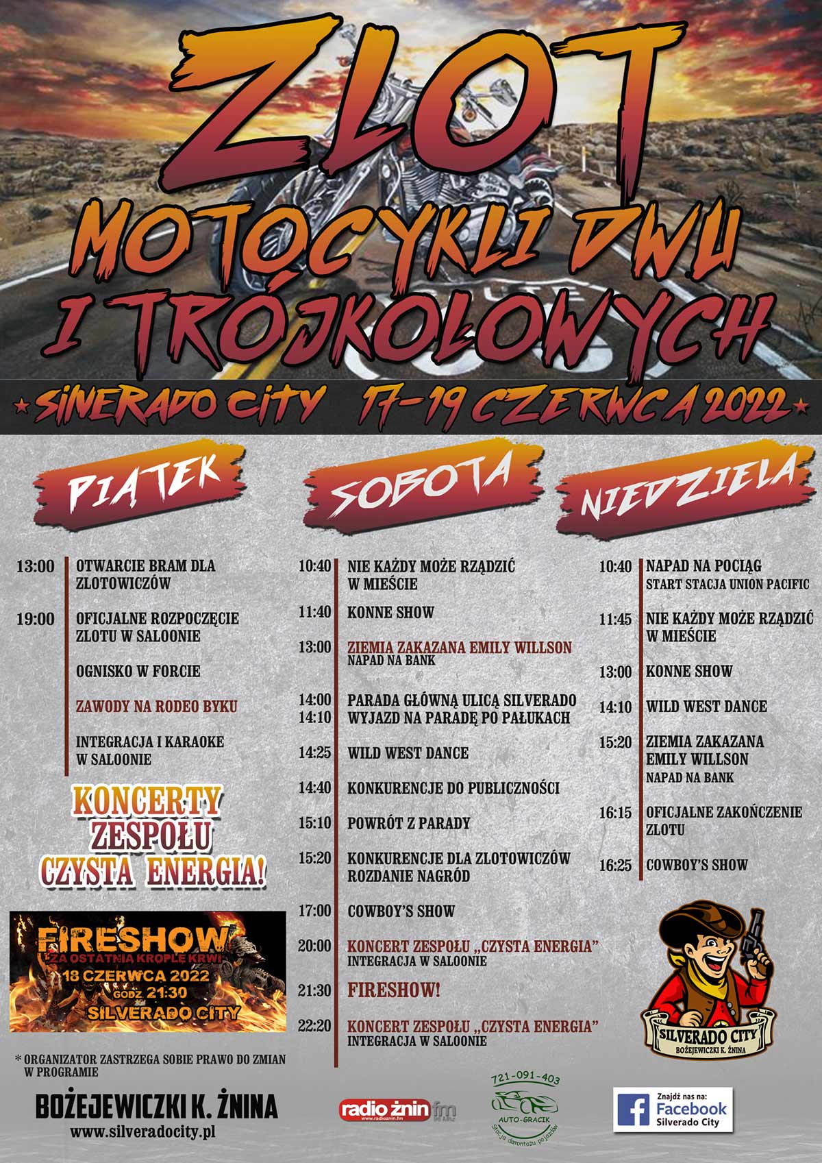 W programie imprezy: Fireshow, konkurencje z nagrodami, parada motocyklowa po Pałukach, pokazy show, pole namiotowe. W sobotę o 21:30 przewidywany jest pokaz "Spektakl ognia - Za ostatnią kroplę krwi". To pokaz ognia z elementami led, a Silverado zmieni się w nawiedzone miasto! W programie: Jeździec bez głowy, Płonący Człowiek, Taniec z Ogniem.