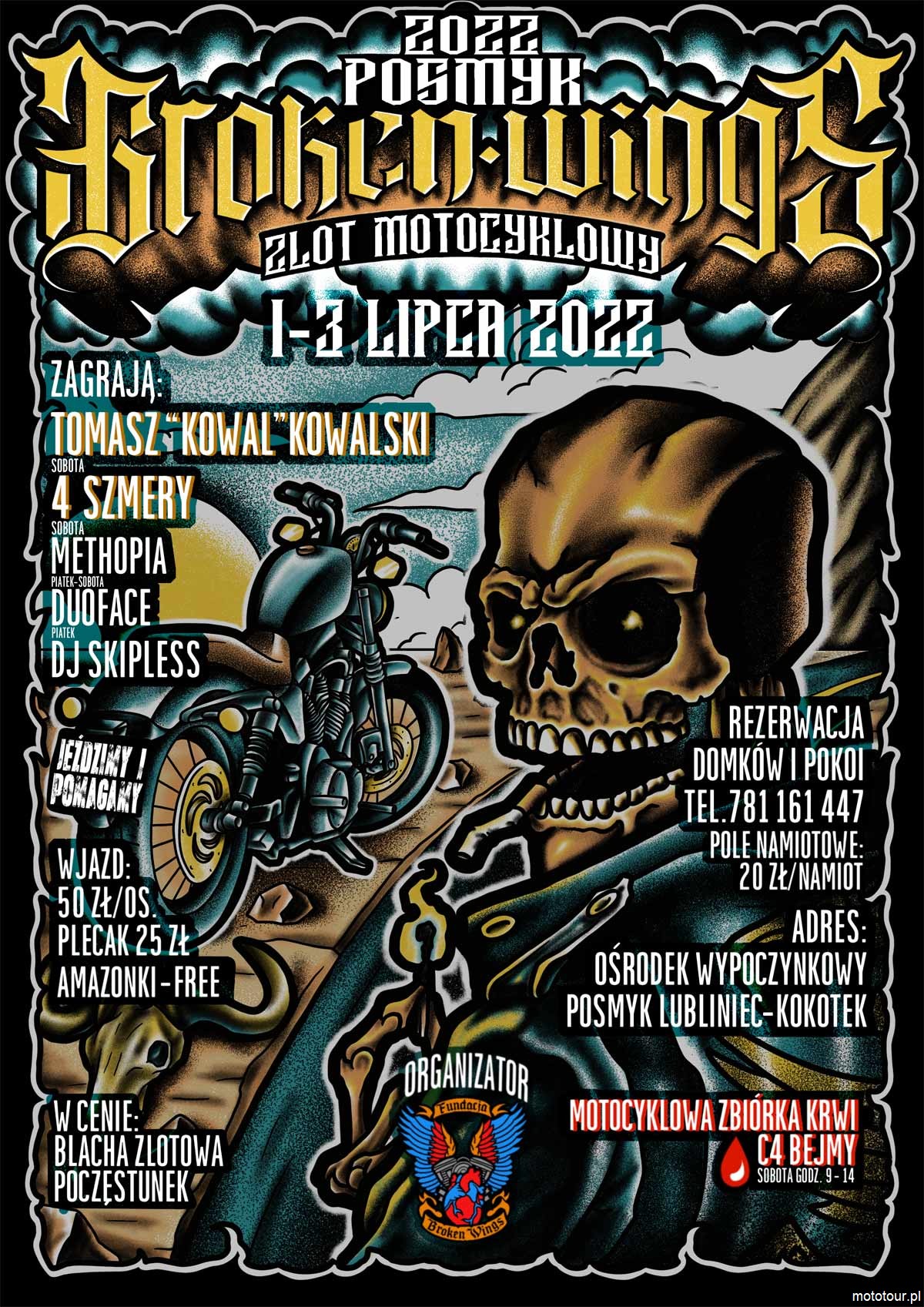 Druga edycja Zlotu Motocyklowego "Broken Wings Posmyk 2022" to impreza nakręcana przez Fundację Broken Wings. Wpadajcie jak zwykle na początku lipca w terminie od 1 do 3 lipca do miejscowości Lubliniec Kokotek w województwie śląskim. Baza znajduje się w ośrodku wypoczynkowym "Posmyk". Zlot jest imprezą charytatywną, z której cały dochód przeznaczony będzie na cele statutowe Fundacji Broken Wings, w tym działanie na rzecz osób poszkodowanych w wypadkach drogowych i ich rodzin, w zakresie leczenia w tym również sanatoryjnego, regeneracji sił i wypoczynku oraz organizowania pomocy prawnej, psychologicznej i rzeczowej.