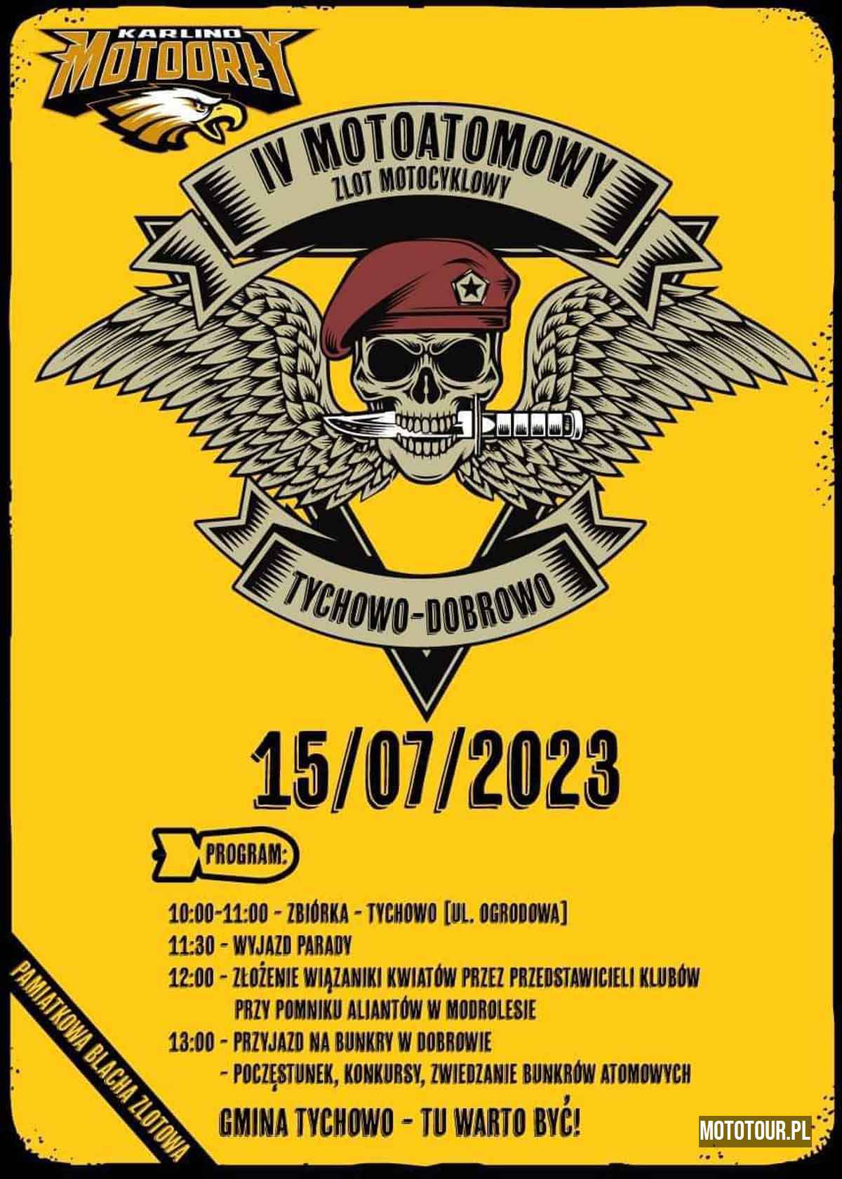 Były bunkry atomowe, a w połowie lipca 2023 r. motocykliści z Karlina, a konkretnie z Motoorły Karlino szykują kolejne wydarzenie. Jak zwykle możecie się spodziewać w czasie VI Motoatomowego Zlotu Motocyklowego wielu atrakcji. Wpadajcie 15 lipca o godzinie 10.00. Od rana Zlot Motoatomowy - Tychowo-Dobrowo, a wieczorem w Połczynie Zdroju dodatkowa atrakcja koncertowa zintegrowana z wydarzeniem tj: BLUESOWY ZJAZD MOTOCYKLOWY. Szykujcie maszyny, kaski i kamizelki! Na miejscu blachy i pole namiotowe do dyspozycji.