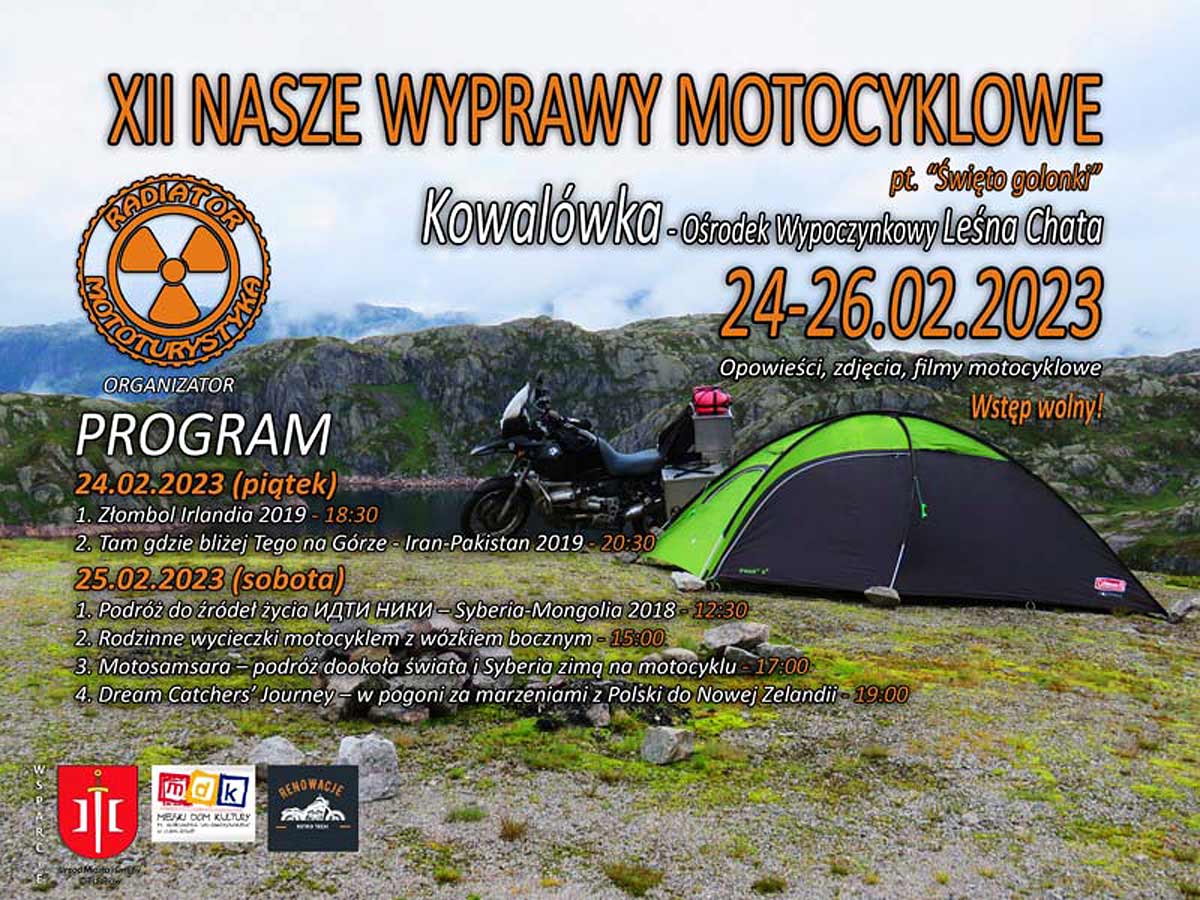 XII edycja spotkań podróżników motocyklowych pod nazwą "Nasze Wyprawy Motocyklowe". W tym roku miejscem spotkań będzie tym razem Kowalówka. Program jest jeszcze dogrywany, ale na miejscu można się spodziewać jak zwykle filmów, opowieści tematycznych, relacji motocyklowych, z różnych zakątków świata i Europy, w wyjątkowej niepowtarzalnej atmosferze podróżniczej. W zapowiedziach znajdą się takie opowieści podróżnicze jak: