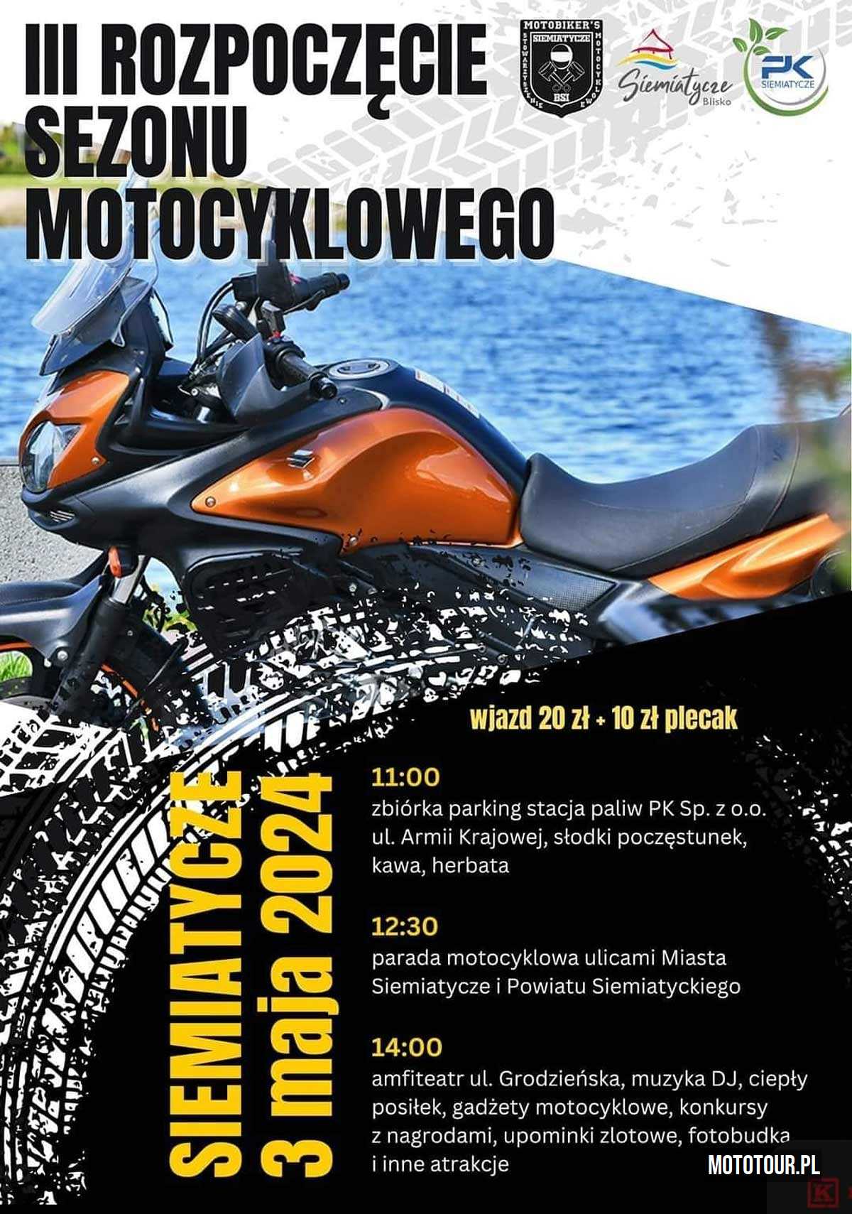Motobikers Siemiatycze zaprasza 3 maja 2024 r. na Rozpoczęcie Sezonu Motocyklowego. Wpadajcie już 3 maja 2024 r. o godzinie 11.00 do Siemiatycz. Zbiórka na parkingu stacji paliw na ul. Armii Krajowej, a potem dalsze atrakcje na terenie Siemiatycz. W programie zlotu parada motocyklowa, gorący poczęstunek, konkursy, zabawy zręcznościowe i koncerty. Wjazd na paradę jest free, a na część gastronomiczną wjazd z talonem na 20 PLN od kasku na gorący poczęstunek. Opłata jest dobrowolna, a opłacenie wejściówki upoważnia do otrzymania pamiątkowej wlepy i ciepłego posiłku.