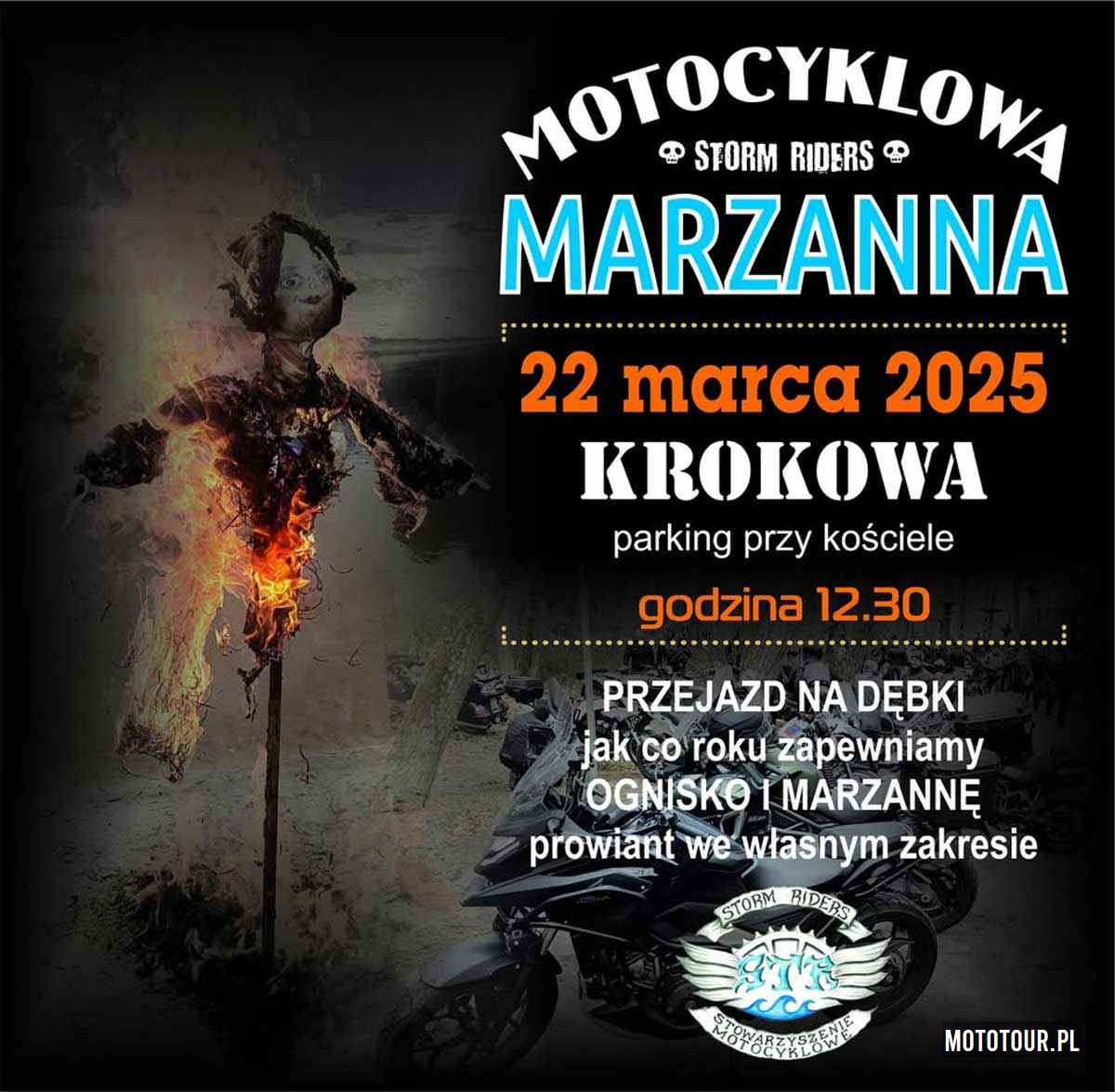 Motocyklowa Marzanna 2025 - Krokowa - Dębki. Zaprasza ekipa Storm Riders. W programie wiele atrakcji. Pożegnanie Zimy - wpadajcie już 22 marca (spotkanie parking w Krokowej przy kościele 12:30) stamtąd przejazd do Dębek gdzie będą czekać paleniska i Marzanna. Prowiant oraz napoje we własnym zakresie. Przy okazji info: Xll Rozpoczęcie Sezonu Motocyklowego Krokowa 2025 zaplanowano na 13 kwietnia 2025 r. Szczegóły wkrótce.