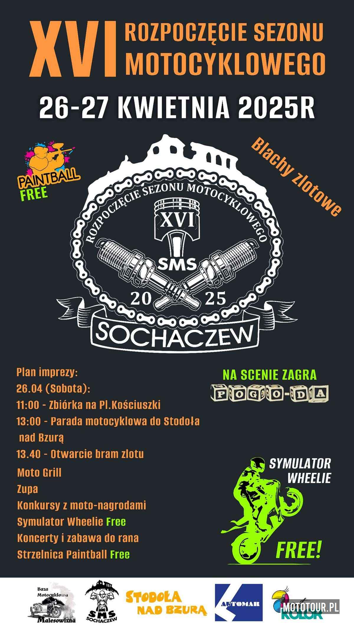 XVI Rozpoczęcie Sezonu Motocyklowego w Sochaczewie to w tym roku impreza dwudniowa nakręcana przez ekipę SMS Sochaczew przy wsparciu i patronacie Burmistrza Miasta Sochaczew. W programie wiele atrakcji, parady, koncerty, coś na zęba, blachy. Zbiórka o 11:00 (zmiana na 12.00) na Placu Kościuszki w Sochaczewie. O godzinie 12.00 Msza w. w Pacynie. O godzinie 13.00 parada motocyklowa. Następnie motocykliści przeniosą się na dalszą część integracji na przystań Januszew nad Wisłą. Tam możliwość noclegu we własnym namiocie.
