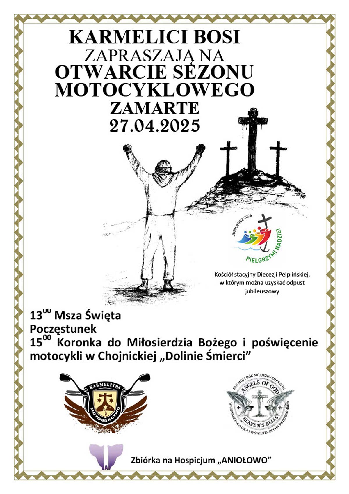 Kolejna edycja spotkania w Zamartem, zorganizowanego przez Ojców Karmelitów Bosych przy współudziale MotoBractwa Karmelitos i Angels of God. Spotkanie już 27 kwietnia 2025 r. o godzinie 13.00 Mszą Świętą. Po mszy poczęstunek, a następnie wspólny paradny wyjazd. O godzinie 15.00 poświęcenie motocykli w Chojnickiej Dolinie Śmierci. Tradycyjnie zbiórka na Hospicjum "Aniołowo". Wpadajcie już 27 kwietnia do Zamartego.
