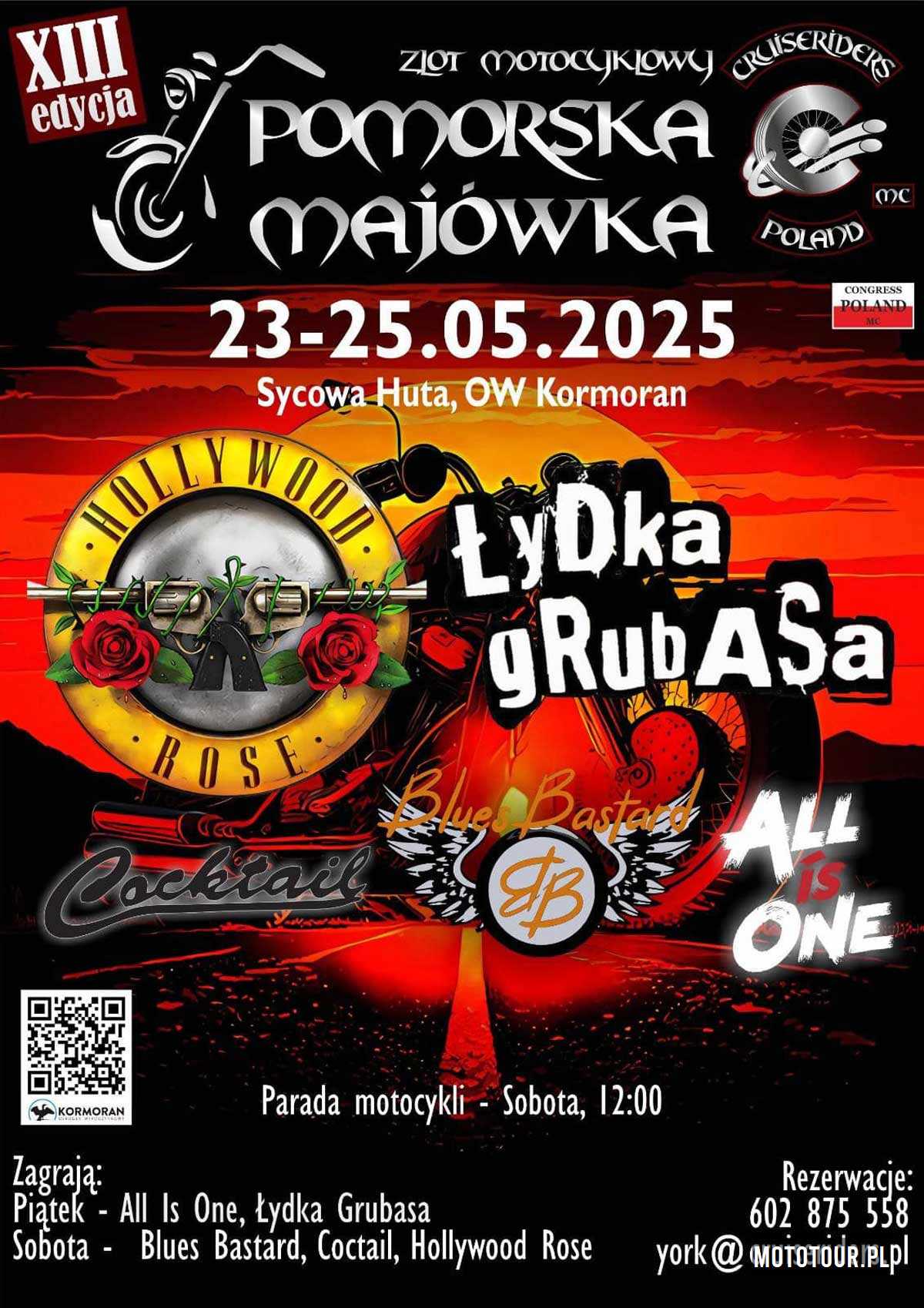 XIII Pomorska Majówka to impreza nakręcana przez Cruiseriders Poland MC. Bazą zlotu jest jak zwykle ośrodek Kormoran Sycowa Huta. W programie bogaty program koncertowy, konkursy z nagrodami i catering, parada w sobotę o godzinie 12.00. Wpadajcie od 23 maja 2025 r.