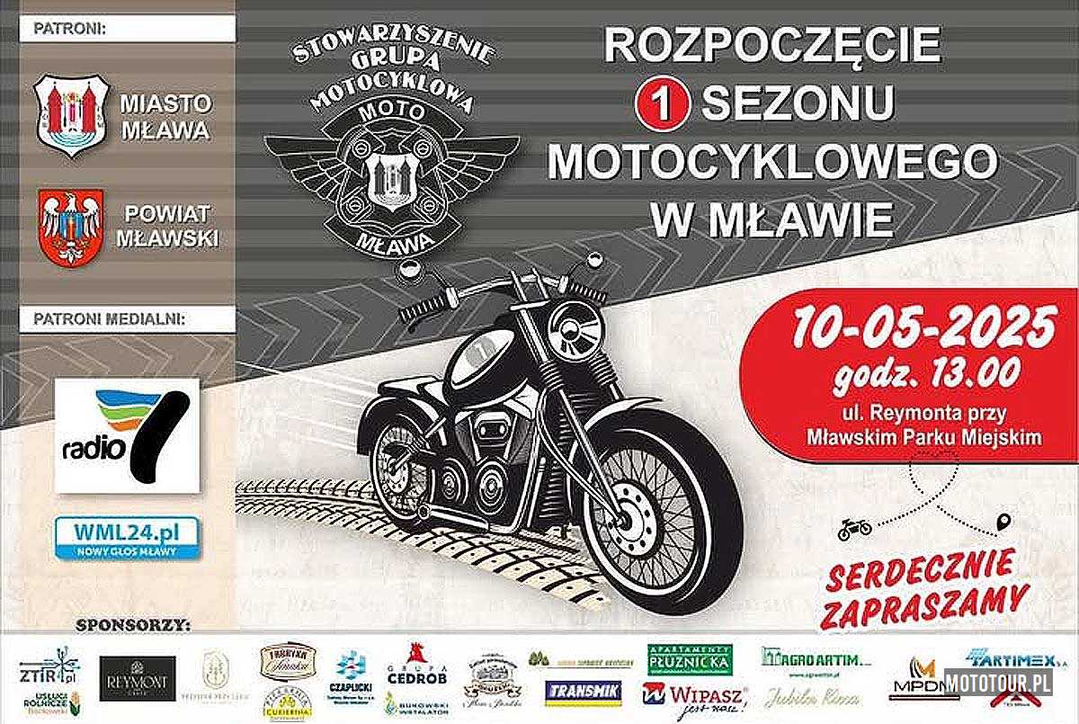 I Rozpoczęcie Sezonu Motocyklowego - Mława 2025. Impreza pod patronatem Burmistrza Mławy. Spotkanie Mława, Stary Rynek 13 o godzinie 13.00. Zaprasza ekipa ze Stowarzyszenia Grupa Motocyklowa Moto-Mława.