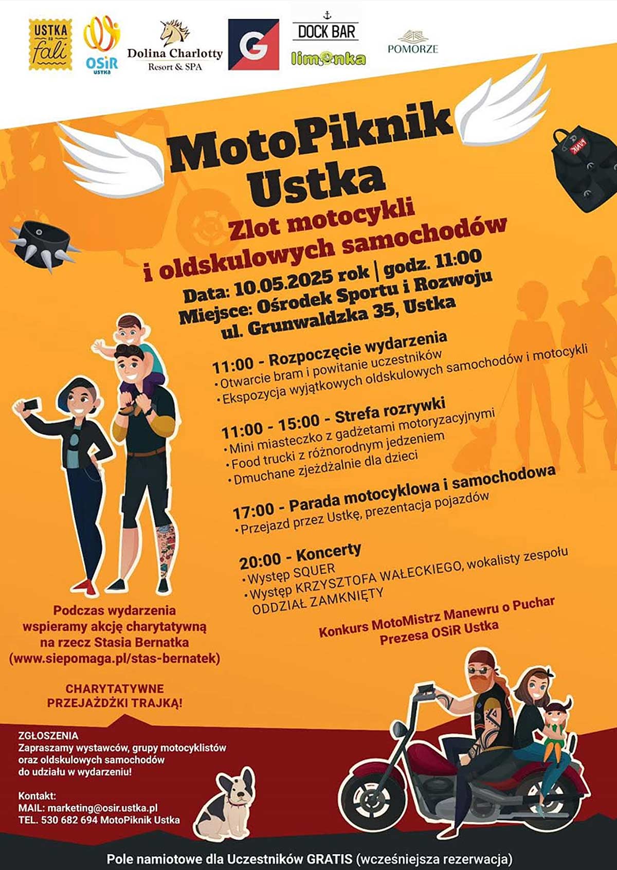 OSiR Ustka zaprasza na Moto Piknik. To impreza integracyjna, zlot motocykli i samochodów oldskulowych. Miejscem spotkania jest Ustka, ul. Grunwaldzka 35, 76-270 Ustka. Start o godzinie 11:00. Podczas wydarzenia będą zbierane pieniążki na leczenie Stasia Bernatka. Możliwość darmowego biwaku po wcześniejszej rezerwacji.