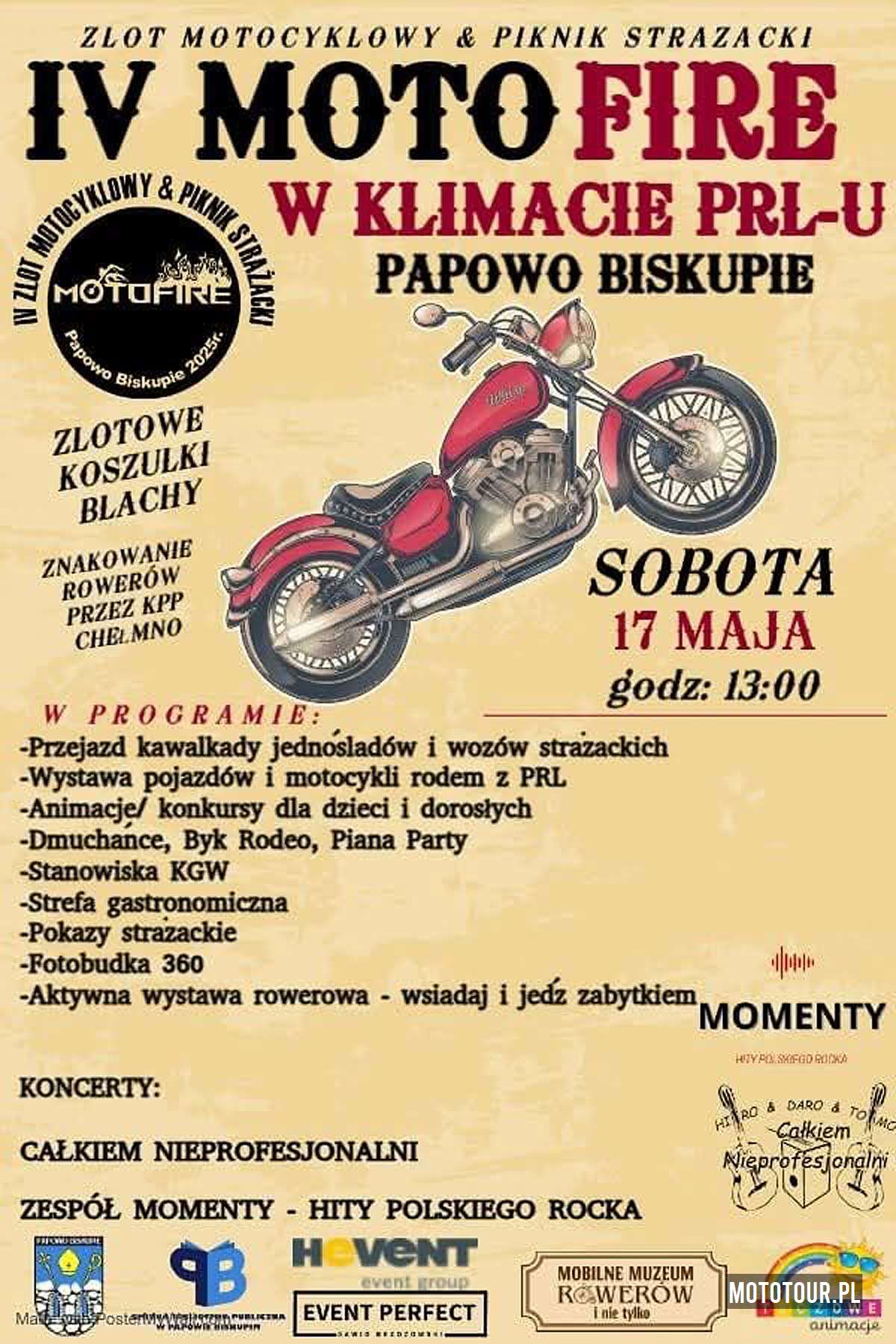 IV MOTOFIRE to połączenie zlotu motocyklowego i pikniku strażackiego. To impreza dedykowana dla wszystkich pasjonatów motocykli, tych małych i dużych, motocyklistów, strażaków, sympatyków jednośladów, wielbicieli wozów strażackich i mieszkańców Gminy Papowo Biskupie oraz gości z okolicznych miejscowości, tych bliższych i tych dalszych. Impreza nakręcana przez Gminną Bibliotekę Publiczną w Papowie Biskupim przy wsparciu Wójta Gminy Papowo Biskupie. Wpadajcie na rozpoczęcie majówki! Organizator przygotował mnóstwo atrakcji. To wszystko w stylu Dzikiego Zachodu, grilowanych kiełbasek i ludycznej zabawy.