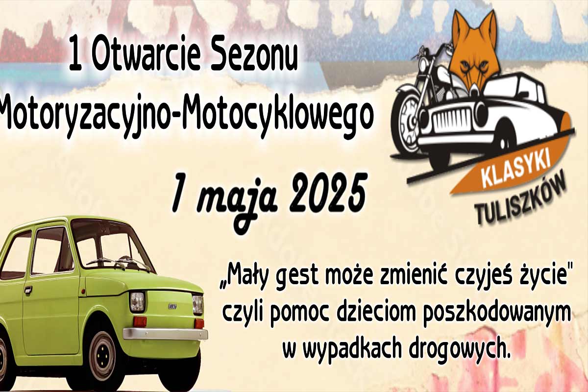 Klasyki Tuliszków zapraszają na Otwarcie Sezonu Motoryzacyjno-Motocyklowego. To jednodniowa impreza pojazdów klasycznych, dzień pełen emocji, dźwięku silników i dobrej zabawy. W trakcie imprezy akcja charytatywna i wiele atrakcji. Wpadajcie już 1 maja do Tuliszkowa od godziny 13.00. 1. Otwarcie Sezonu Motoryzacyjno- Motocyklowego Klasyki Tuliszków odbędzie się na Stadionie Miejskim w Tuliszkowie ul. Nortowska 16. Zachęcamy do wzięcia udziału we mszy św. otwierającej uroczystość o godz. 13.00 w kościele pw. św. Wita w Tuliszkowie.