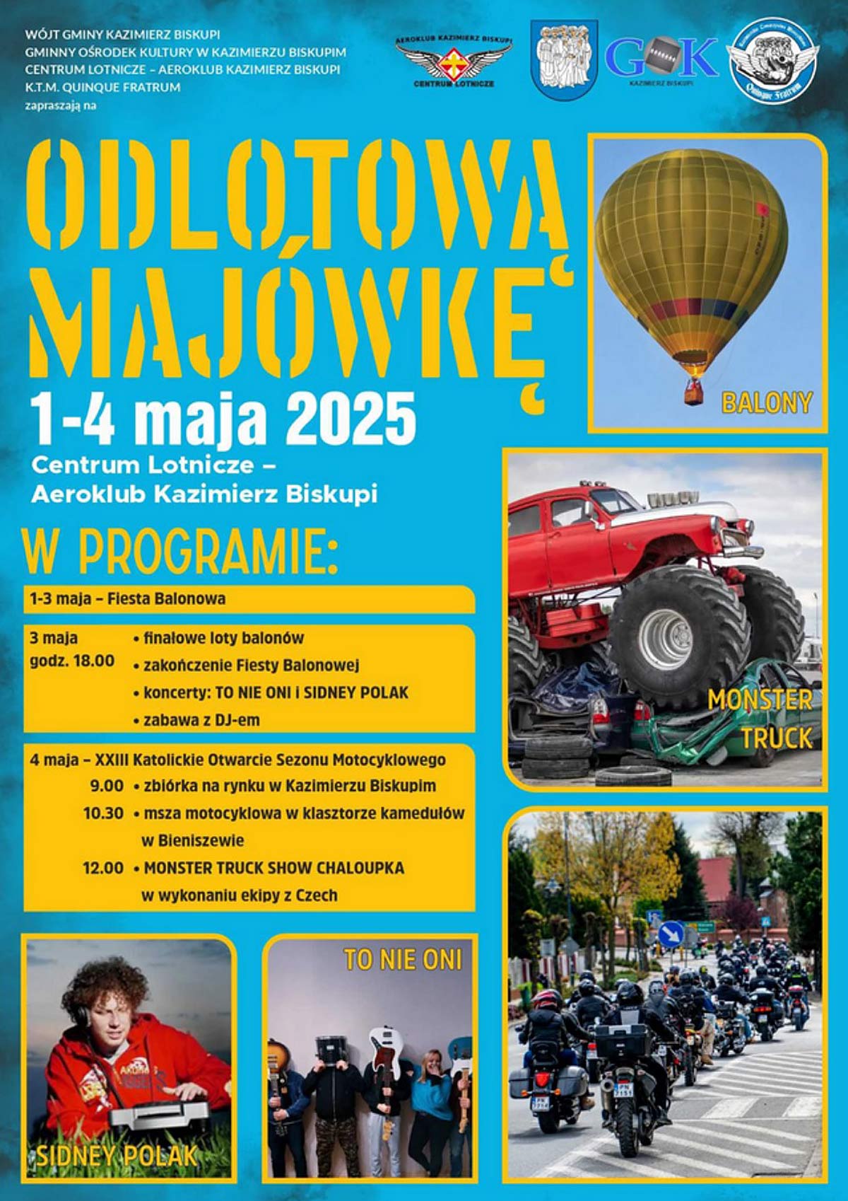 Odlotowa Majówka w Kazimierzu Biskupim 2025. Impreza nakręcana przez Centrum Lotnicze - Aeroklub Kazimierz Biskupi. W programie niesamowite widoki i niezapomniane emocje, koncerty, Monster Truck Show, a balony wzniosą się nad Kazimierskie niebo! 4 maja tradycyjne Katolickie Otwarcie Motocyklowe i Msza Św. dedykowana motocyklistom w Klasztorze Kamedułów w Bieniszewie. Katolickie Otwarcie Sezonu Motocyklowego w Kazimierzu Biskupim to z kolei impreza nakręcana przez Quinque Fratrum. W programie koncerty, pokazy motocyklowe, stoiska z asortymentem motocyklowym, szeroka gama wystawców. Dokładna rozpiska i program znajdziecie na plakacie.