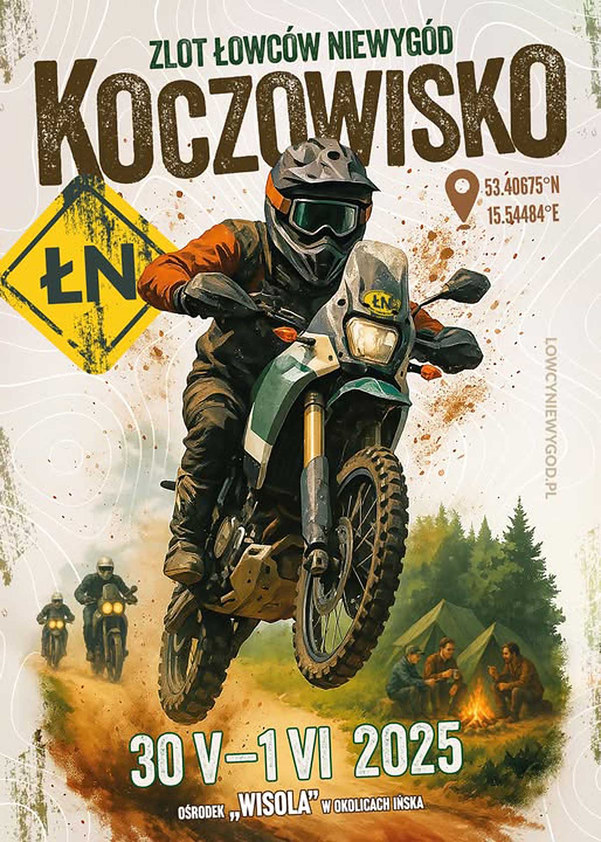 Impreza integracyjna ekipy z forum i grupy Łowcy Niewygód pod nazwą Koczowisko. To połączenie rajdu terenowego i spotkania grupy pasjonatów jazdy w terenie. Miejscem spotkania jest ośrodek Wisola. Dla kogo jest ta impreza? To trzy dni w pięknych okolicznościach przyrody, 220 km terenowej trasy, oferującej kurz, piasek i błoto, czyli łowców złoto. Luźna impreza bez napinki, wyścigów i klasyfikacji. Możesz snuć się swoim tempem i chłonąć, to co oferuje okoliczna przyroda i mijane wiejskie sklepy. Byle sobotnim wieczorem dotrzeć na ognisko, gdzie zapewne będzie można wysłuchać mnóstwa motoopowieści luźno opartych na faktach. Jeśli...