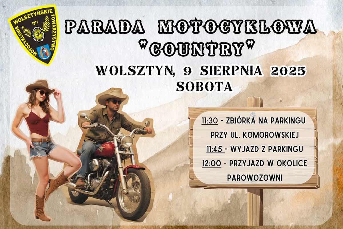 Parada Motocyklowa Country 2025 w Wolsztynie to impreza organizowana przez Wolsztyńskie Towarzystwo Motocyklowe. Impreza w Wolsztynie odbędzie się 9 sierpnia 2025 r. od godziny 11.30. W programie parada, następnie integracja i wiele innych atrakcji... po paradzie.