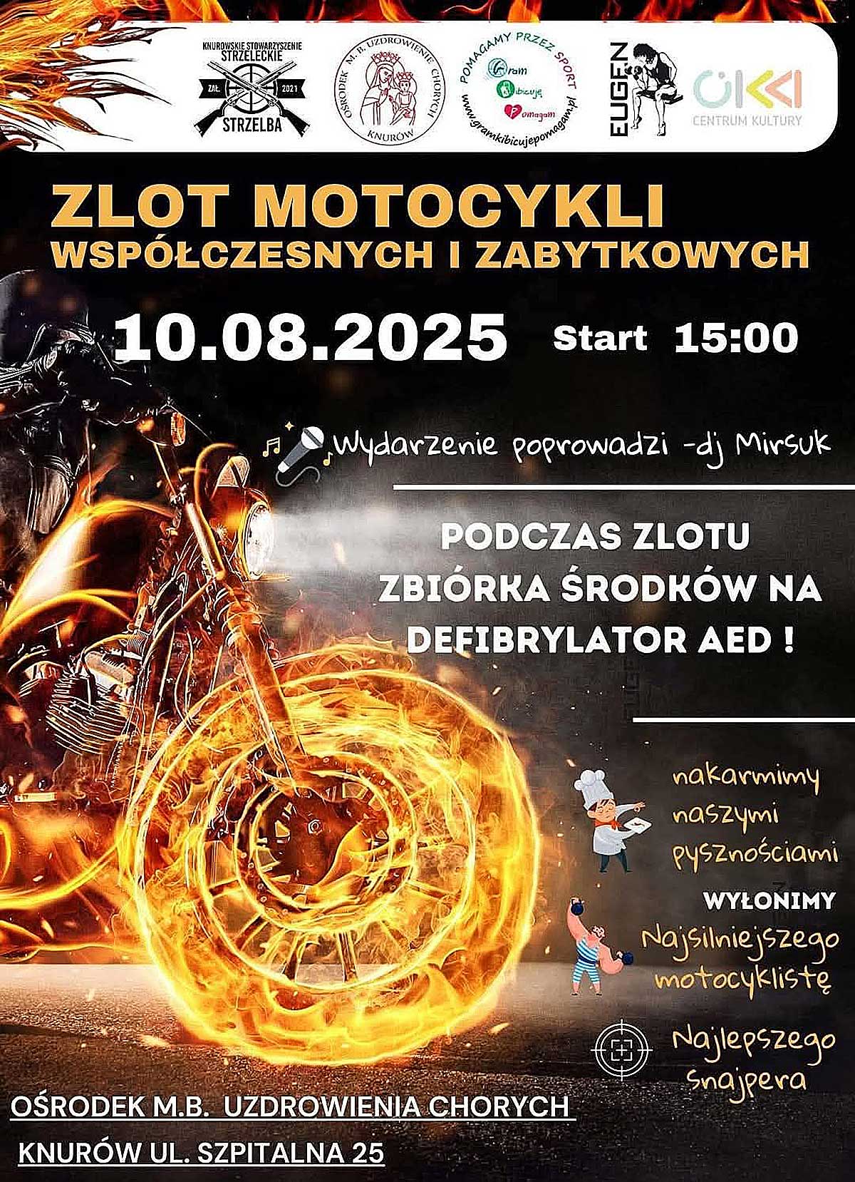 Zlot Motocykli Współczesnych i Zabytkowych - Knurów. Miejsce spotkania Knurów, ul. Szpitalna 25, od godziny 15.00. Impreza charytatywna. Podczas spotkania wiele konkursów i konkurencji w tym wybranie najsilniejszego motocyklisty i najlepszego snajpera.