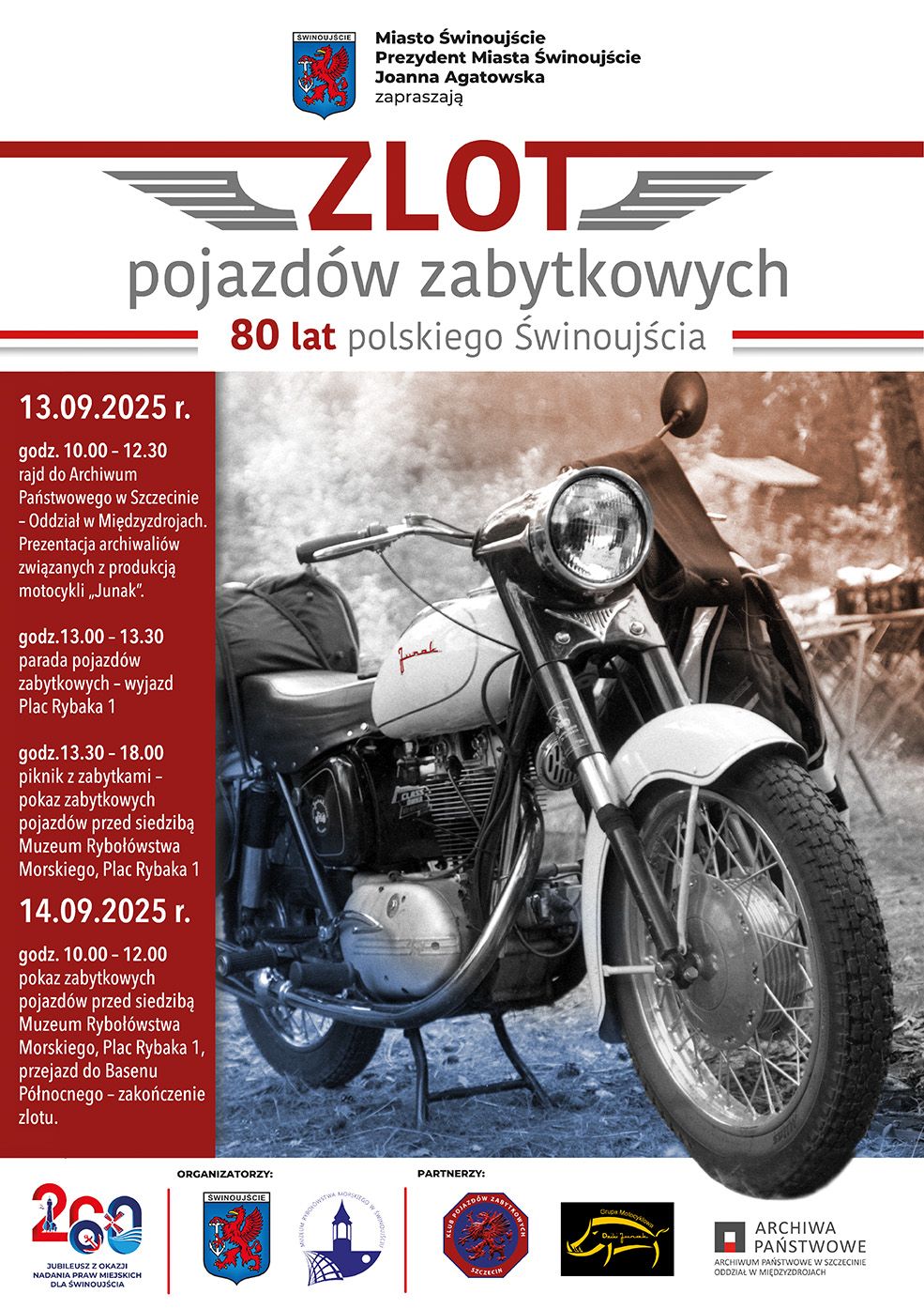 Impreza nakręcana przez Muzeum Rybołówstwa Morskiego w Świnoujściu z okazji 80-lecia polskiego Świnoujścia. W programie przejazd zabytkowych pojazdów z Placu Rybaka na Basen Północy. Tam będzie czas na zrobienie zdjęć i tam nastąpi koniec weekendu z zabytkowymi pojazdami. Zaproszenie zarówno dla właścicieli zabytkowych pojazdów, jak i ich miłośników. Wydarzenie współorganizowane z Archiwum Państwowym w Szczecinie Oddział w Międzyzdrojach, Klubem Pojazdów Zabytkowych Szczecin i Grupą Dziki Junak. Początek o godzinie 10.00.