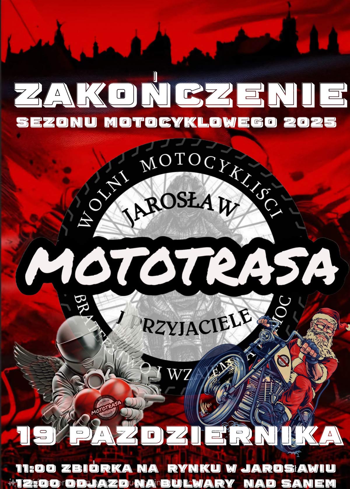 Zakończenie Sezonu Motocyklowego - Jarosław. Wpadajcie już 19 października 2025 r., od godziny 11.00. Spotkanie się na rynku w Jarosławiu, by wspólnie przejechać na Bulwary Jarosławskie nad Sanem i tam, przy ogniskach, razem celebrować symboliczne zakończenie sezonu motocyklowego. W trakcie akcji zbiórka na Jarosławskie Moto Mikołaje Dzieciom.