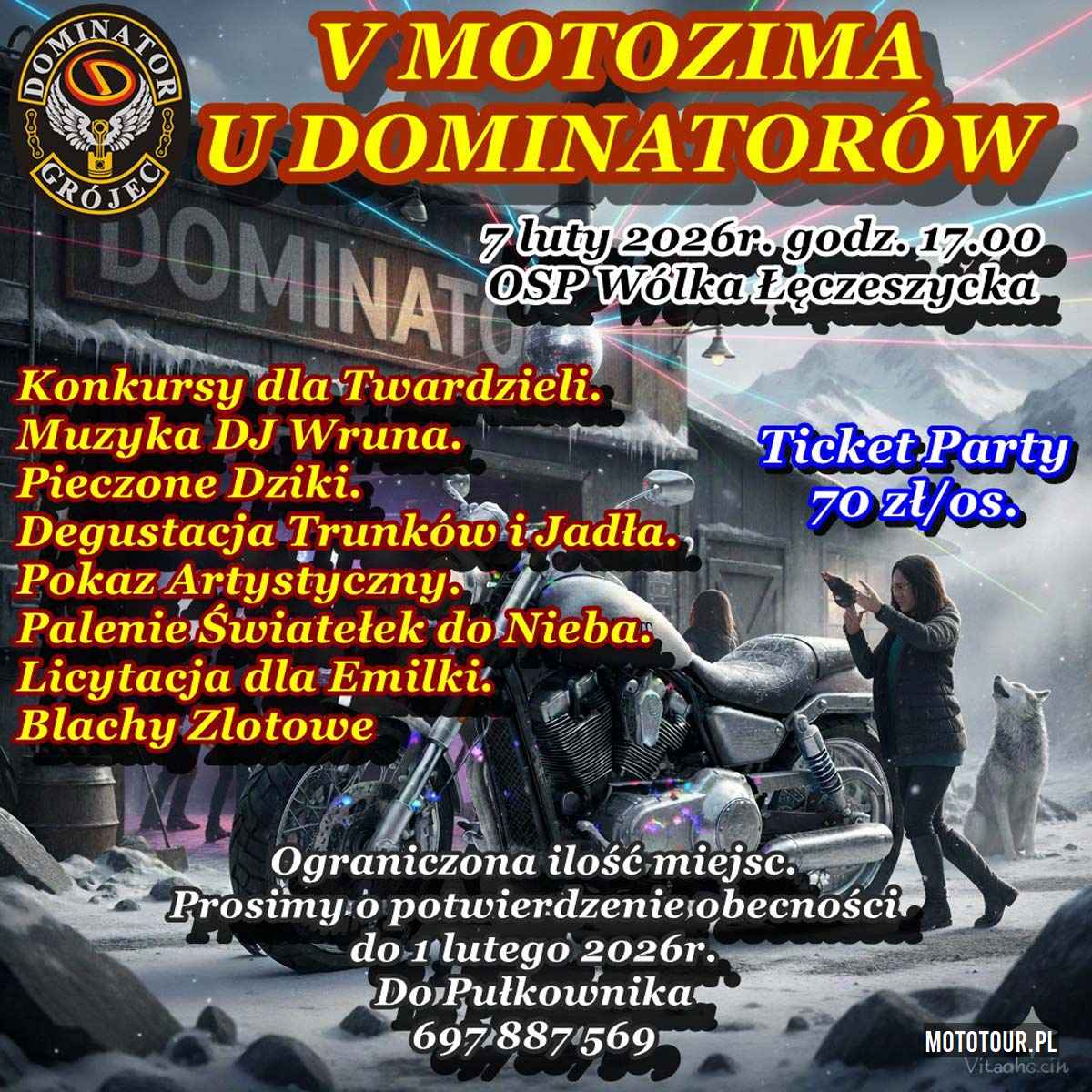 Klub Motocyklowy Dominator Grójec jest organizatorem imprezy pod V Motozima. Impreza odbędzie się na terenie OSP Wólka Łęczeszycka. Potwierdzenie udziału w imprezie prześlijcie do Pułkownika do 1 lutego na podany powyżej numer tel.