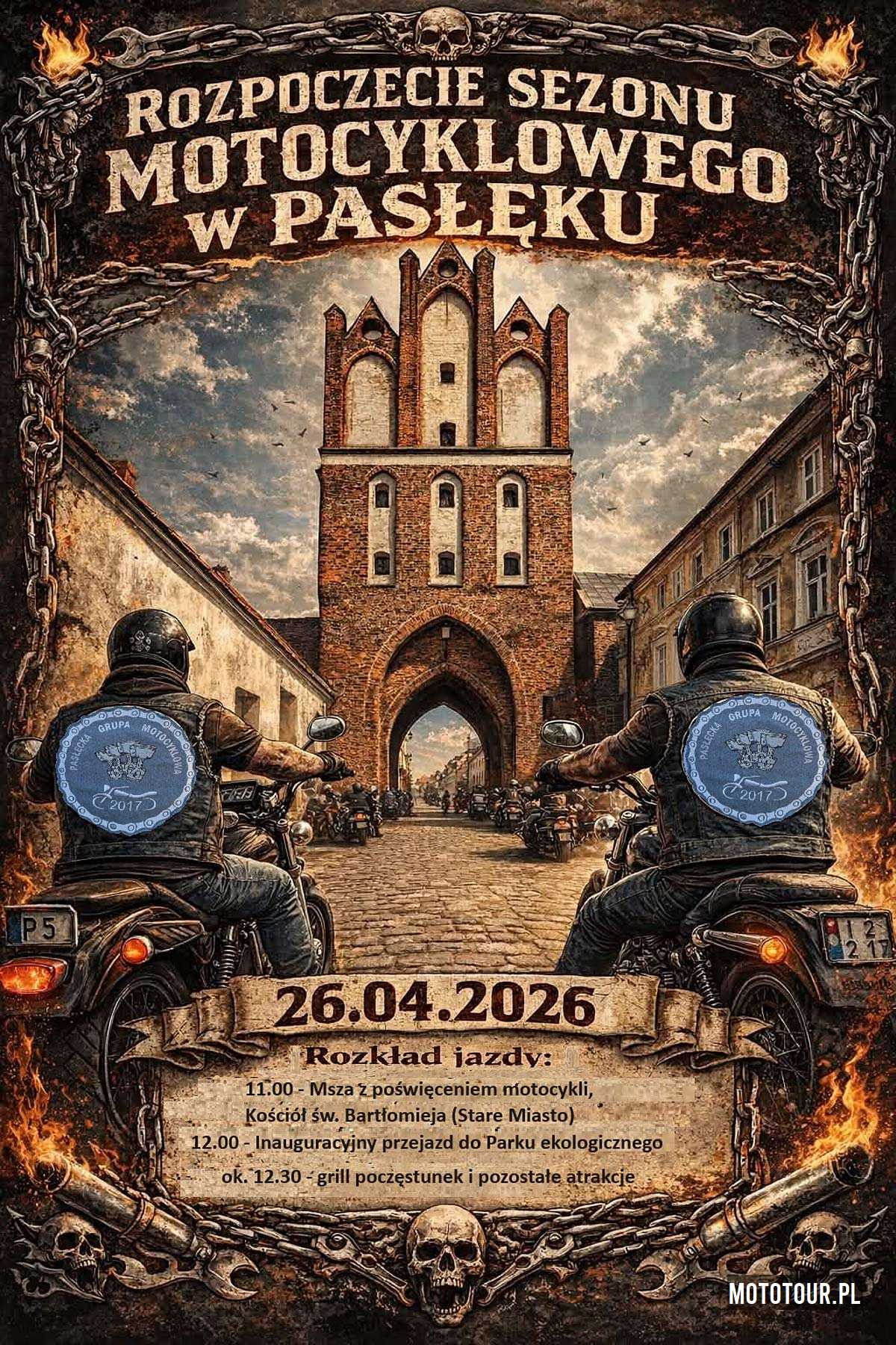 Otwarcie Sezonu Motocyklowego 2026 Pasłęk. Imprezę nakręca Pasłęcka Grupa Motocyklowa. Spotkanie i miejsce spotkania to parking Kościoła św. Bartłomieja - Stare Miasto.