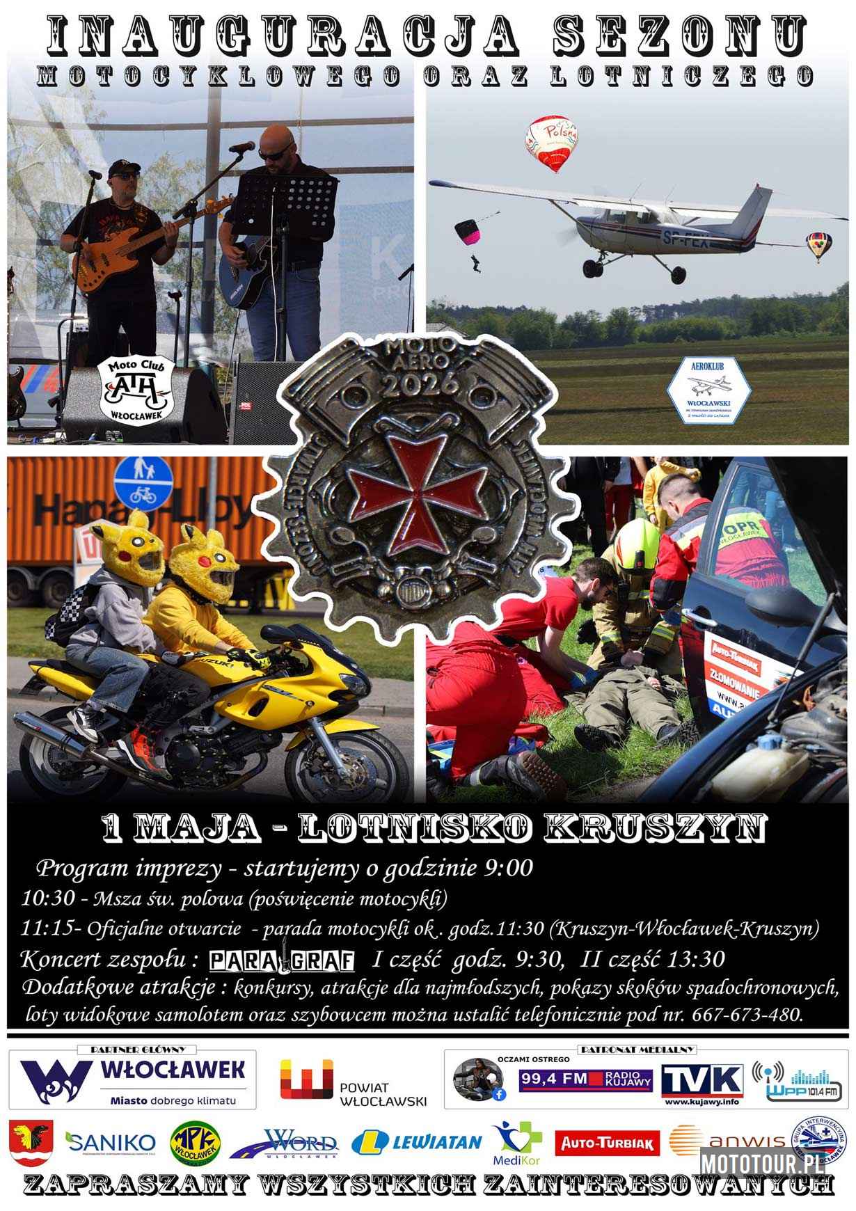 ATH MOTOCLUB Włocławek i Aeroklub Włocławek jest organizatorem kolejnej edycji Moto-Aero 2026 – Inauguracji Sezonu Motocyklowego i Lotniczego. Wpadajcie już 1 maja 2026 r. o godzinie 9.00 na lotnisko KRUSZYN - Włocławek. Na terenie lotniska będzie mnóstwo stoisk z gadżetami motocyklowymi i nie tylko. Jednym słowem każdy znajdzie coś dla siebie. W programie msza św. polowa, następnie poświecenie przybyłych maszyn, parada motocykli ulicami Włocławka. Koncerty zespołów Paragraf - 9:00 oraz Czaqu - 14:00. Nie zabraknie konkursów, atrakcji. Wpadajcie tradycyjnie 1 maja na lotnisko.