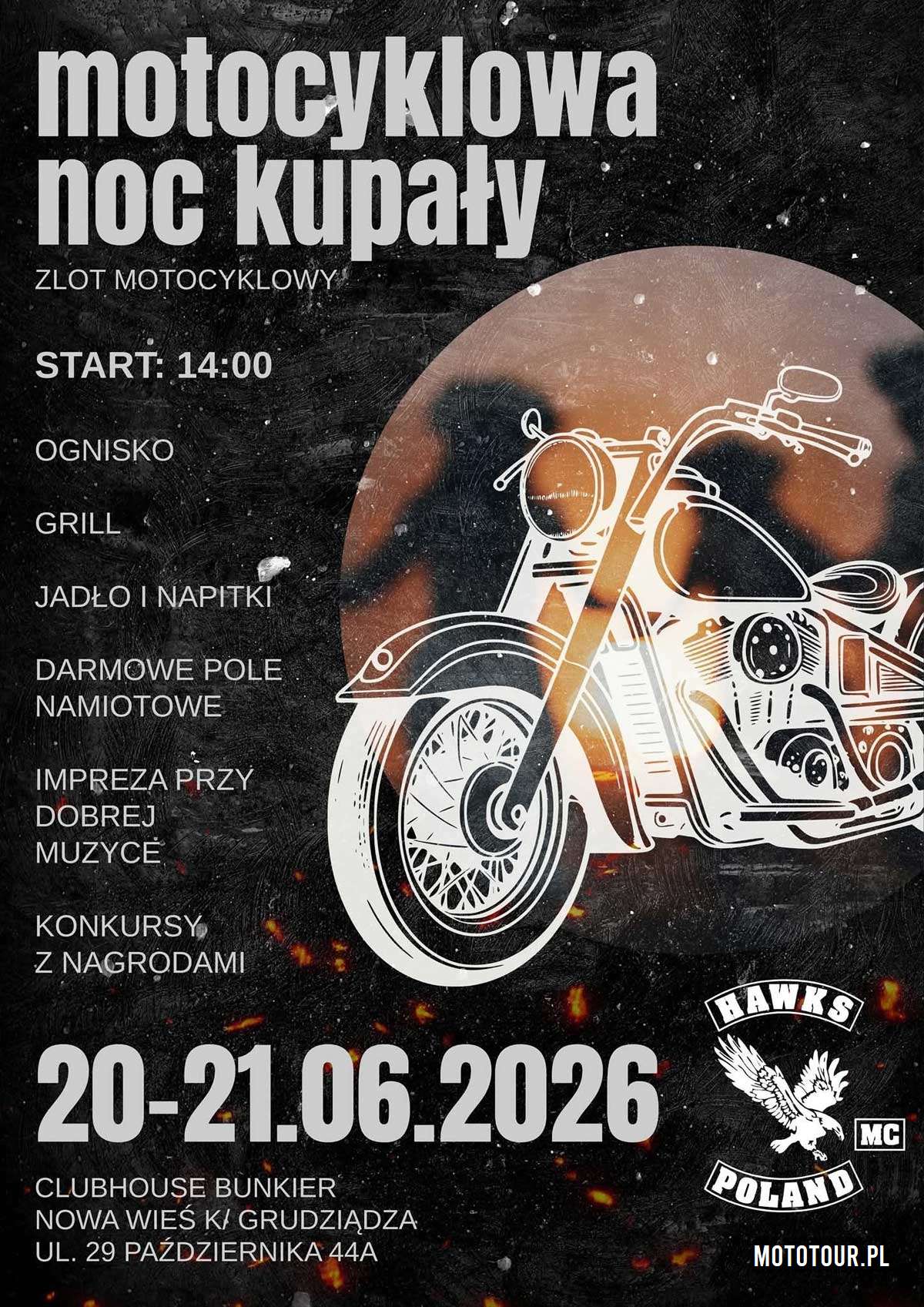Motocyklowa i do tego Hawksowa Noc Kupały 2026 to impreza nakręcana przez Klub Motocyklowy Hawks MC Poland. Początek zaczyna się rodzinnie w klubie rodziny Hawksów pod Grudziądzem. Co będzie potem trudno przewidzieć, ale nie będzie to impreza dla grzecznych chłopców. Impreza odbędzie się w clubhousie w miejscowości Nowa Wieś koło Grudziądza, ul. 29 Października 44. Wpadajcie już 20 czerwca od godziny 16.00. Więcej informacji znajdziecie na plakacie.