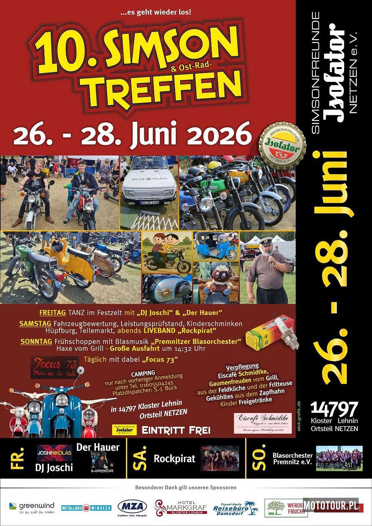 10. Simson & Ost Rad Treffen 2026 - 10. Zlot Simsona to impreza dedykowana generalnie nie tylko dla właścicieli i pasjonatów motocykla Simson, ale też do wszystkich, którzy są zainteresowani pojazdami i motoryzacją z dawnego DDR. Wjazd na imprezę jest bezpłatny, wpadajcie już od 26 do 28 czerwca 2026 do miejscowości 14797 Netzen, Niemcy.