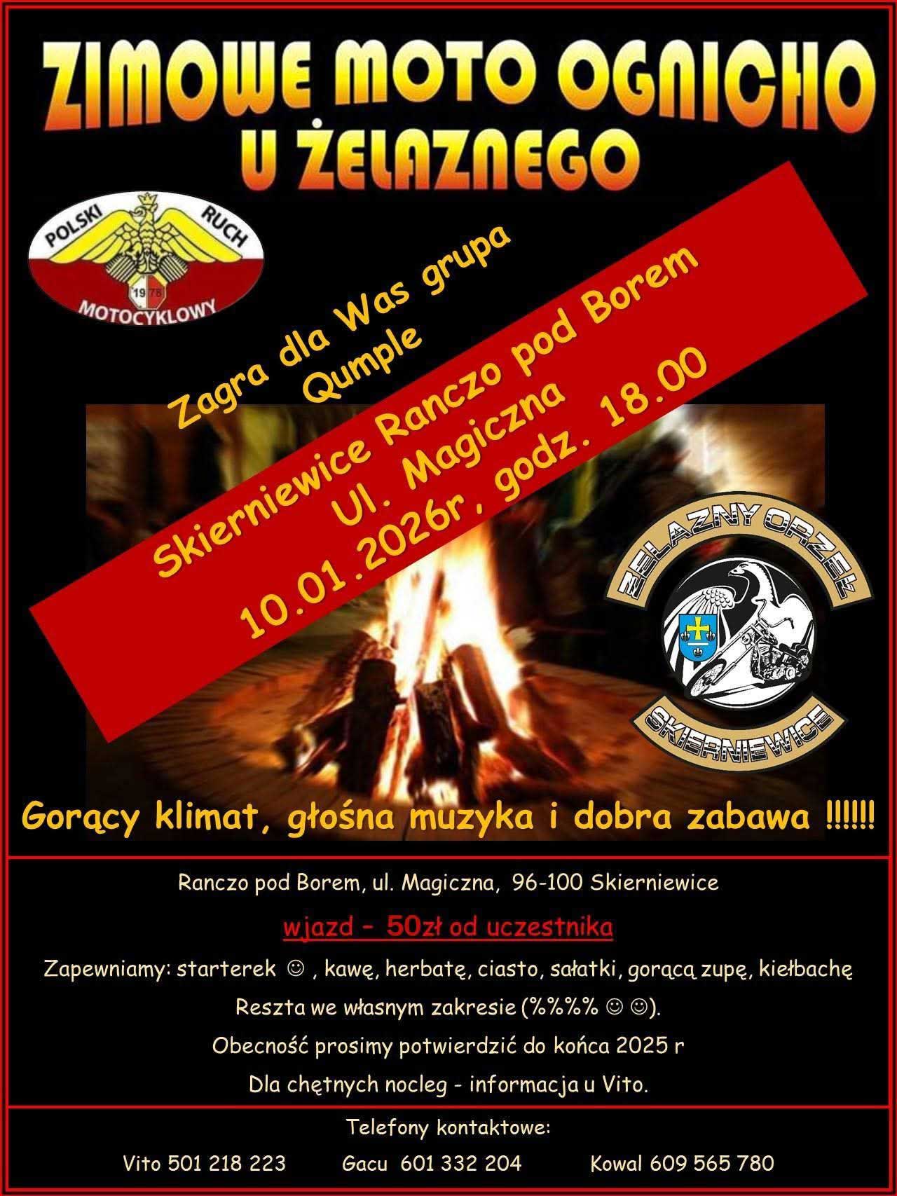 Kolejna edycja spotkania w środku zimy. Wpadajcie już 10 stycznia 2026 r. na Zimowe Moto Ognicho u Żelaznego. To cykliczna impreza dla motocyklistów, którzy nie boją się wyzwań i zimy. Impreza ma charakter integracyjny. Organizator zapewnia dobra muzykę, ognisko i zestaw startowy, a resztę to musicie już załatwić we własnym zakresie. Początek o godzinie 18.00. Wszystkie informacje na profilu. Bazą imprezy jest Rancho pod Borem, ul. Magiczna, Skierniewice.