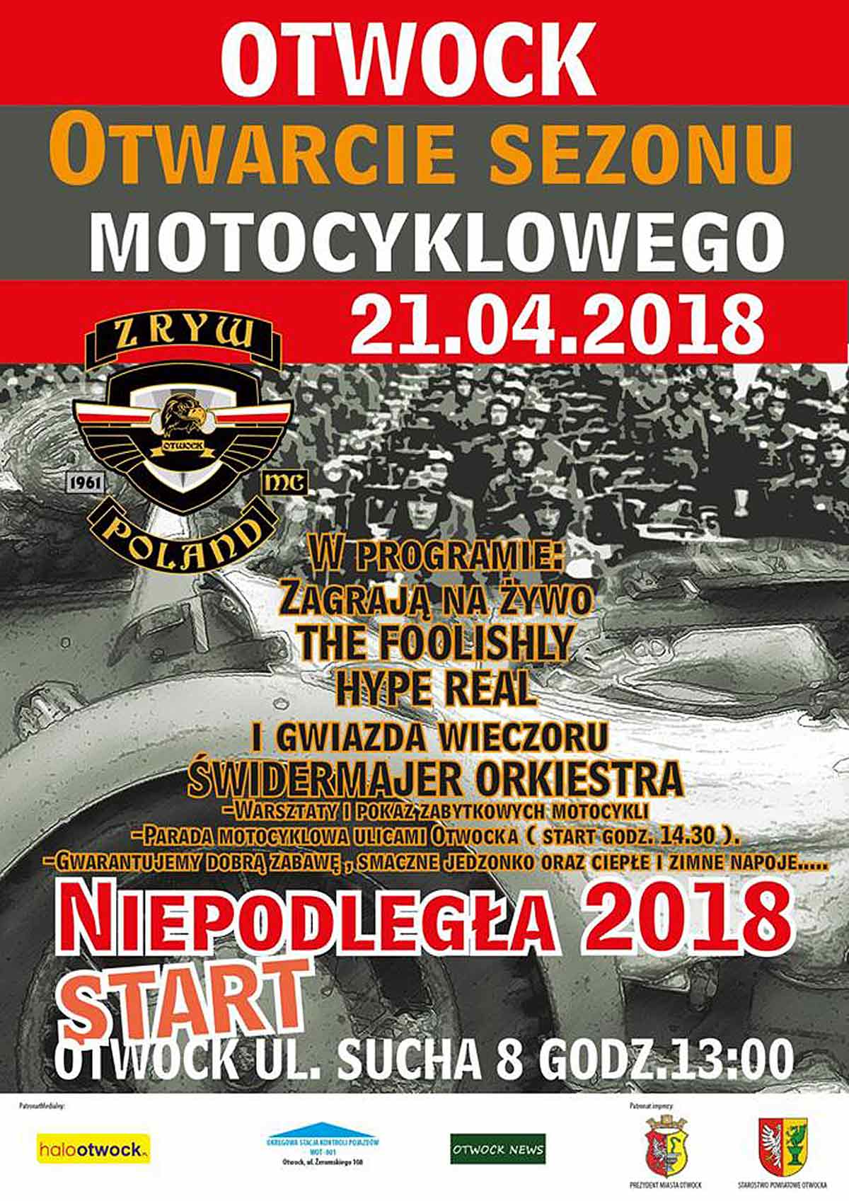 Zryw MC Poland serdecznie zaprasza na Otwockie rozpoczęcie sezonu motocyklowego. Zagrają dla Was: The Foolishly, Hype Real, Świdermajer Orkiestra. Głodnych nakarmimy, spragnionych napoimy:) Dla każdego coś dobrego...