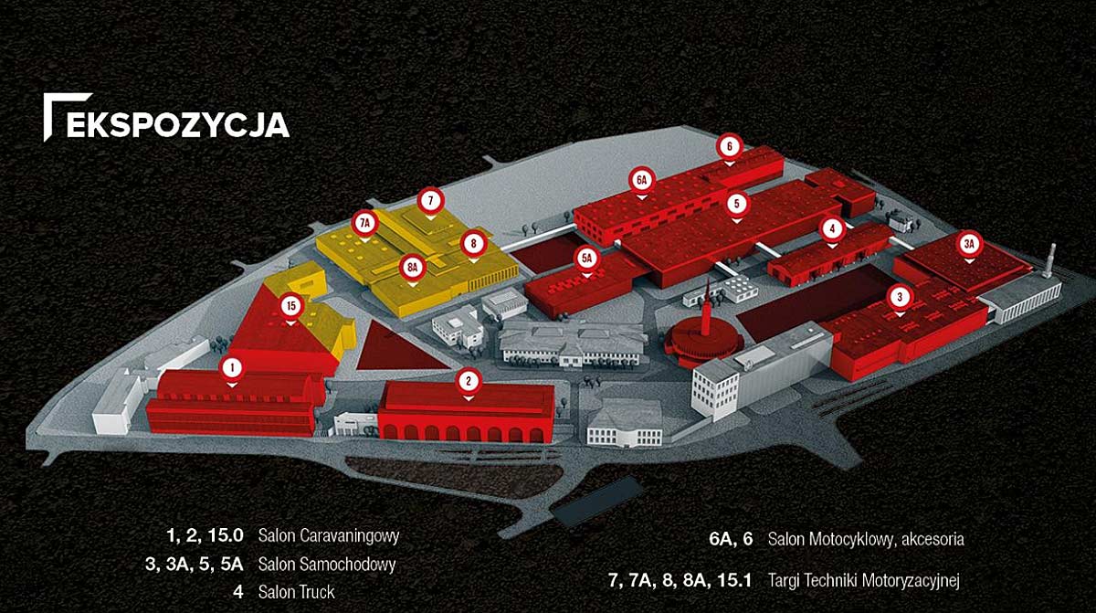 Schemat i rozmieszczenie hal i ekspozycji w czasie targów Motor Show 2018 - Poznań