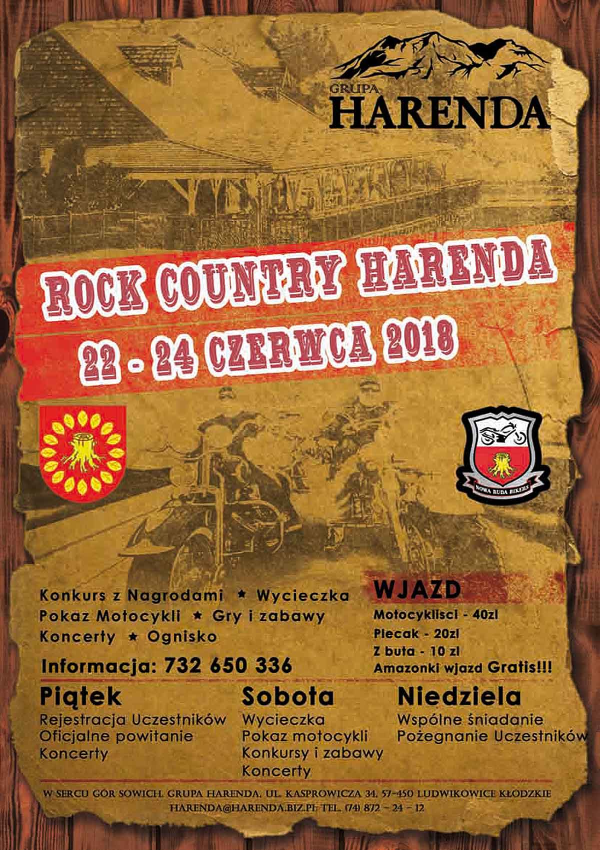 Zlot Motocykli Rock Country Harenda 2018 w Ludwikowicach Kłodzkich. Wjazd : Amazonki - Gratis Motocykliści - 40 zł Plecak - 20 zł Z buta - 10 zł
