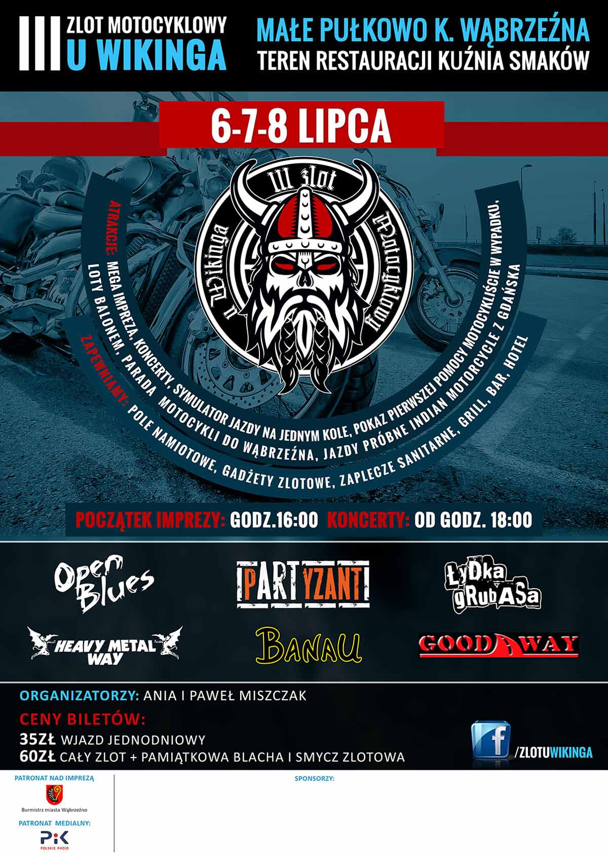 Zapraszamy na Zlot u Wikinga! Imprezę dla miłośników dobrej muzyki i motocykli! Zapewniamy koncerty, konkursy i inne atrakcje, jak pokaz medyczny, loty balonem, symulator jazdy na jednym kole, jazdy próbne Indian Motorcycle i wiele innych! Na miejscu dostępne pole namiotowe, grill, bar itp.