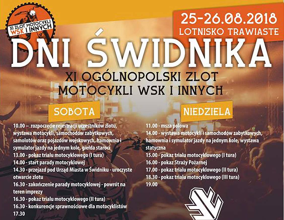 Jedyny w swoim rodzaju: "Zlot Motocykli WSK i innych". W programie: giełda staroci i części motocyklowych, kolejny etap reaktywacji motocykla WSK, pokazy, konkursy, koncerty... Początek godz 9.00. W tym roku „Zlot Motocykli WSK i innych” został zintegrowany z oficjalną częścią obchodów „Dni Świdnika”. Impreza motocyklowa dostała więc finansowy zastrzyk i merytoryczny potencjał, szczególnie widoczny w koncertowym repertuarze. Od rana w sobotę 25 sierpnia będzie jednak wybitnie na motocyklowo: klasyczne konkursy, parady i spotkania tematyczne. Wieczorem w sobotę zagrają gwiazdy: zespół Acid Drinkers, grupa Golec Orkiestra. Niedziela to rodzinny piknik i muzyczne bity zespołów Happysad i Łąki Łan.