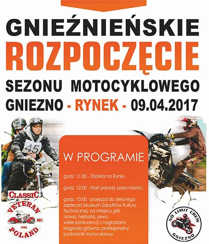 Klub Motocykli Zabytkowych „Classic" wspólnie z No Limit Crew jest organizatorem kolejnej edycji "Gnieźnieńskiego Rozpoczęcia Sezonu Motocyklowego". Zbiórka o godz. 11.30 na rynku. Parada ulicami miasta, przejazd na zielone zaplecze Muzeum Zabytków Kultury Technicznej na miejscu grill i napoje.