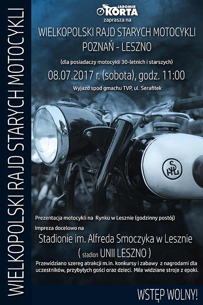 Wielkopolski Rajd Starych Motocykli. Wyjazd i zbiórka pojazdów jak zwykle spod budynku TVP w Poznaniu przy ulicy Serafitek. Warunkiem udziału w rajdzie jest posiadanie motocykla zabytkowego min. 30 letniego. Trasa rajdu prowadzi przez urokliwe zakątki wielkopolski. Meta i baza rajdu znajduje się w Lesznie.