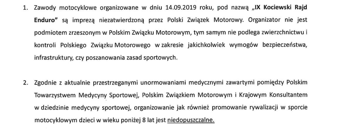 "zawody motocyklowe pod nazwą "Kociewski Rajd Enduro" są imprezą niezatwierdzoną przez Polski Związek Motorowy, a co za tym idzie, organizator tego wydarzenia nie podlega kontroli regulaminowej PZM w zakresie bezpieczeństwa, infrastruktury czy poszanowania zasad sportowych. "