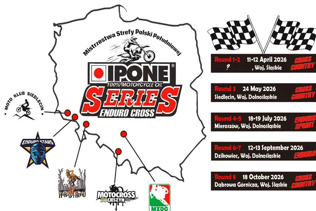Ipone Enduro Cross Series - Tor Mieroszów 2026 - Mistrzostwa Str. Impreza rozgrywana na terenie toru motocrossowego w Mieroszowie. Trasa prowadzi po naturalnym, urozmaiconym terenie, bez przeszkód technicznych. Zawody odbędą się na nowym torze motocrossowym otwartym w lipcu 2025 z inicjatywy stowarzyszenia Enduro Stars. Tor ma długość około 10 km z trzema sekcjami: cross country, enduro i hard enduro. Na zew. spory parking i padok dla zawodników.